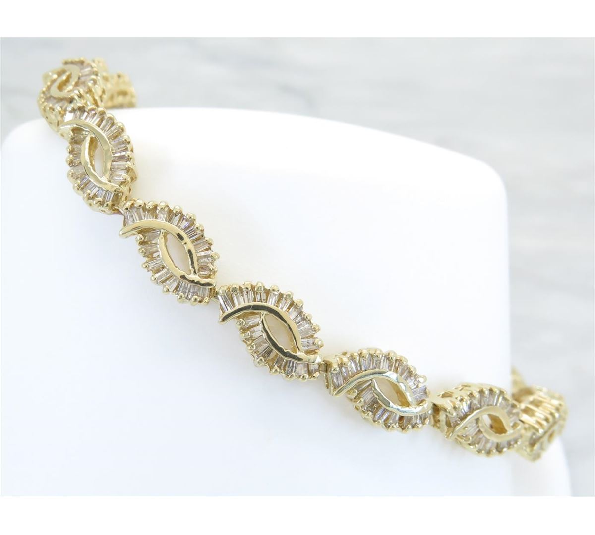 One tested 14K yellow gold diamond bracelet. Containing: 288 Baguette Cut Diamonds. Clarity: I, Color: H-J. Approximate total diamond weight: 2.08CTW. Diamonds are graded in the mounting, unless otherwise stated. Weight of bracelet: 15.3 grams. Size: 7" long.
