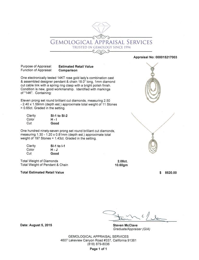 One electronically tested 14KT rose gold lady's combination cast & assembled designer pendant & chain 18.0" long, 1mm diamond cut cable link with a spring ring clasp with a bright polish finish. Identified with markings of "14K". Condition is new, good workmanship. Containing: Eleven prong set round brilliant cut diamonds, measuring 2.50 - 2.40 x 1.59mm (depth est.) approximate. Total Weight of 11 Stones = 0.65ct. Graded in the setting. Clarity: SI-1 to SI-2. Color: H - I. Cut Good One Hundred Ninety-Seven prong set round brilliant cut diamonds, measuring 1.30 - 1.20 x 0.81mm (depth est.) approximate. Total Weight of 197 Stones = 1.43ct. Graded in the setting. Clarity: SI-1 to I-1. Color: H - Good. Total Weight of Diamonds 2.08ct. Total Weight of Pendant & Chain 10.60gm. GAS Appraised at $8,520.00.