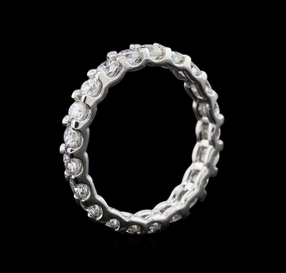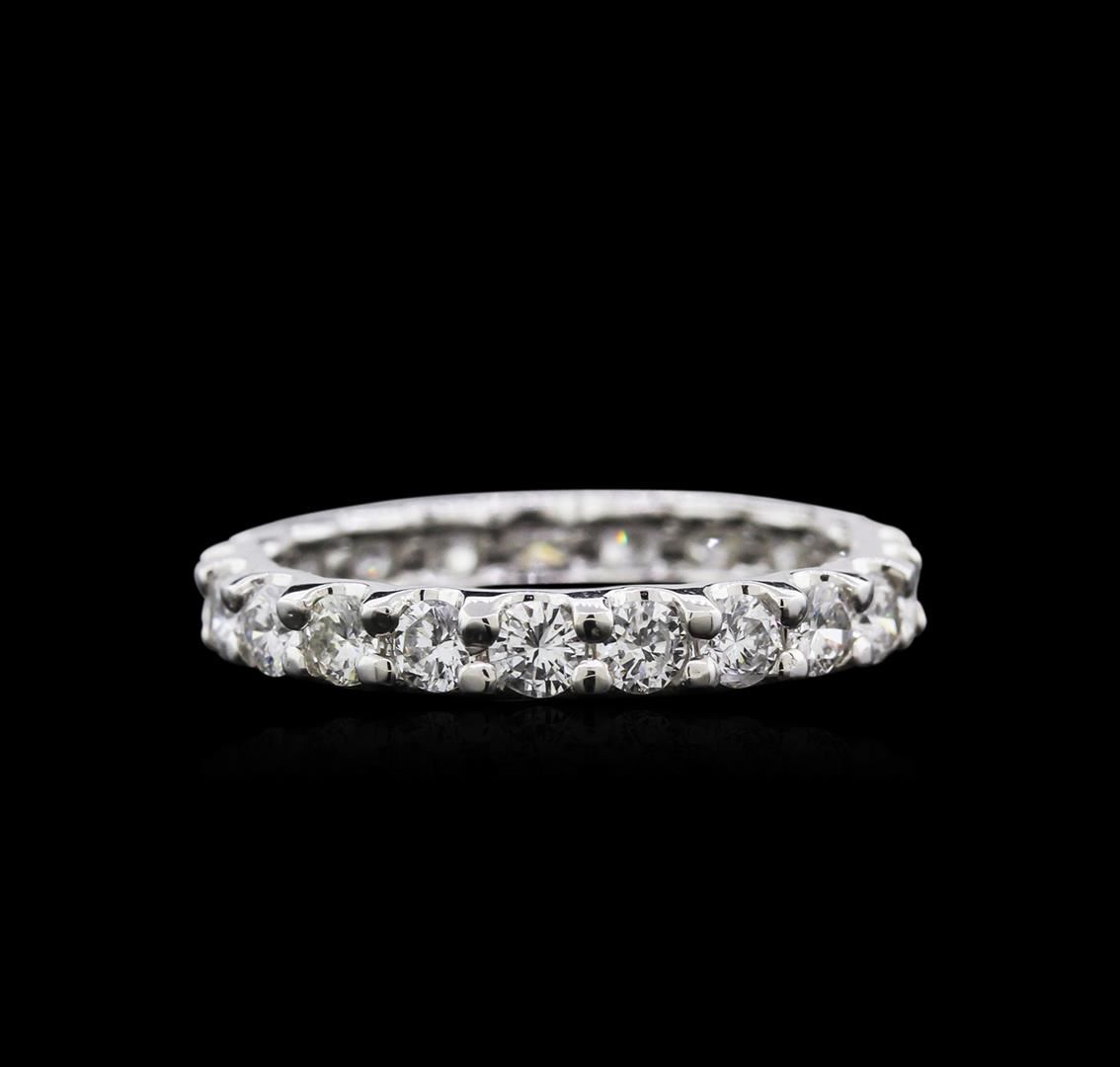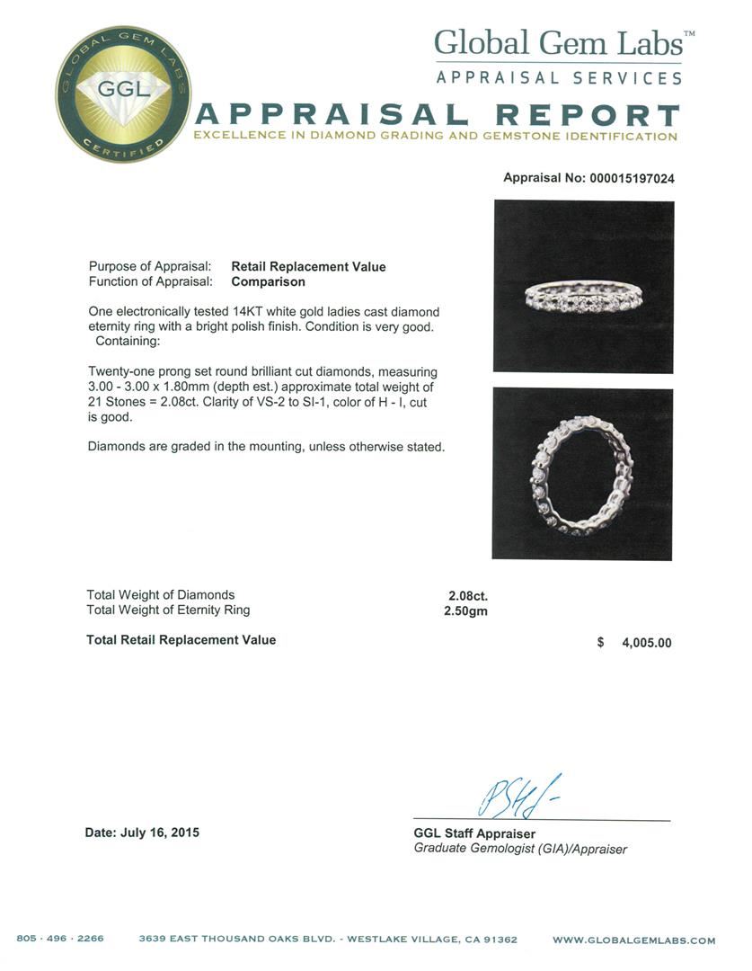 One electronically tested 14KT white gold ladies cast diamond eternity ring with a bright polish finish. Condition is very good. Containing: Twenty-One prong set round brilliant cut diamonds, measuring 3.00 - 3.00 x 1.80mm (depth est.) approximate total w GGL Appraised at $4,005.00.