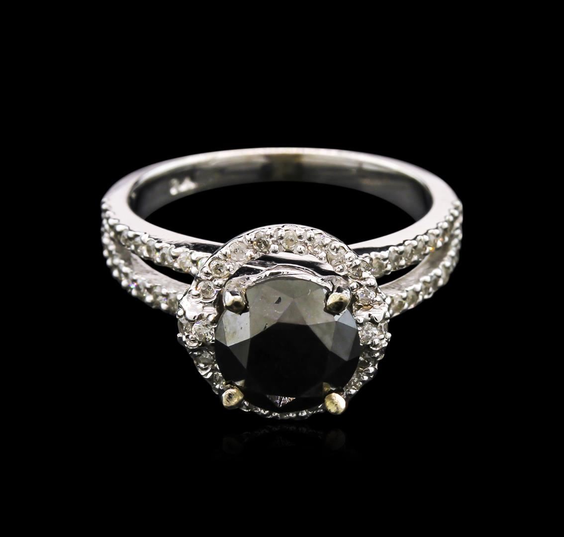 One electronically tested white gold ladies cast black and white diamond ring with a bright polish finish. Condition is new, good workmanship. The featured black diamond is set within a white diamond bezel, supported by diamond set split shoulders and completed by a two millimeter wide band. Containing: One prong set round brilliant cut diamond, measuring 7.00 - 7.00 x 4.27mm (depth est.), 20.00% GTCF approximate weight of 1.73ct. Indications of multiple laboratory enhancements. The specific gravity of black diamond is 3.120to 3.165. Diamond tester results are non reactive. Graded in the setting. Clarity: : Fancy Black; Irradiated. Depth: 61.0%.Table: 58.6%.Seventy-two prong set round brilliant cut diamonds, measuring 1.00 - 1.00 x 0.60mm (depth est.) approximate total weight of 72 Stones = 0.36ct. Graded in the setting. Clarity: I-1 to I-2.Color: H - J. AIG Appraised at $3,085.00.