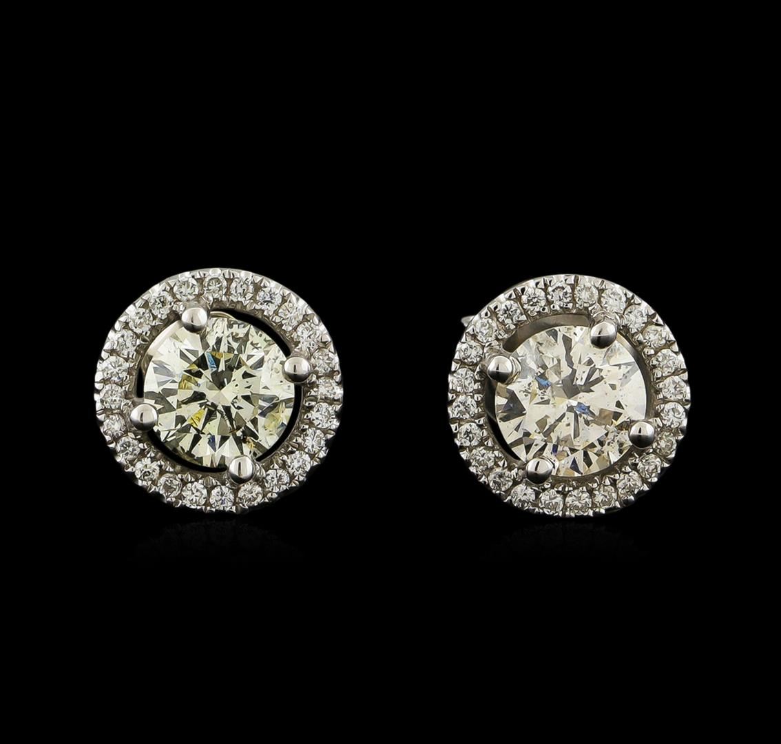 One pair electronically tested 14KT white gold cast & assembled diamond earrings with standard backs. Each earring features a round diamond solitaire set within a diamond halo. Identified with markings of "14K". Condition is new, good workmanship. Containing: One prong set round brilliant cut diamond, measuring 6.30 - 6.27 x 3.77mm (depth est.), 2.00.%. GTCF approximate weight of 0.93ct with a strong blue fluorescence. Graded in the setting. Clarity: I-1. Color: 59.9%. Table 58.5%. One prong set round brilliant cut diamond, measuring 6.30 - 6.28 x 3.80mm (depth est.) approximate weight of 0.92ct with a medium blue fluorescence. Graded in the setting. Clarity: I-1. Color: 60.4%. Table 58.8%. Forty-Eight prong set round brilliant cut diamonds, measuring 1.20 - 1.00 x 0.66mm (depth est.) approximate total weight of 48 Stones = 0.24ct. Graded in the setting. Clarity: VS-1 to VS-2. Color: G - H. Total Weight of Diamonds 2.09ct. Total Weight of Earrings 3.67gm. AIG Appraised at $14,750.00.