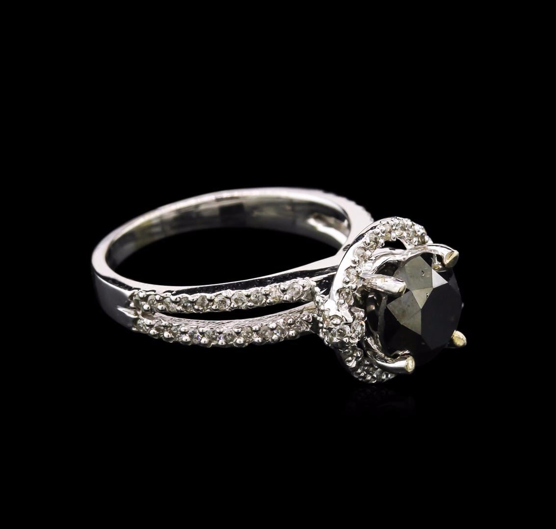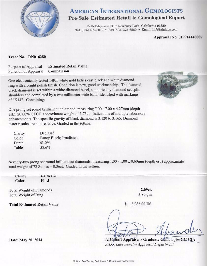 One electronically tested white gold ladies cast black and white diamond ring with a bright polish finish. Condition is new, good workmanship. The featured black diamond is set within a white diamond bezel, supported by diamond set split shoulders and completed by a two millimeter wide band. Containing: One prong set round brilliant cut diamond, measuring 7.00 - 7.00 x 4.27mm (depth est.), 20.00% GTCF approximate weight of 1.73ct. Indications of multiple laboratory enhancements. The specific gravity of black diamond is 3.120to 3.165. Diamond tester results are non reactive. Graded in the setting. Clarity: : Fancy Black; Irradiated. Depth: 61.0%.Table: 58.6%.Seventy-two prong set round brilliant cut diamonds, measuring 1.00 - 1.00 x 0.60mm (depth est.) approximate total weight of 72 Stones = 0.36ct. Graded in the setting. Clarity: I-1 to I-2.Color: H - J. AIG Appraised at $3,085.00.