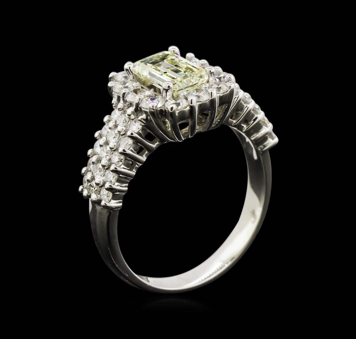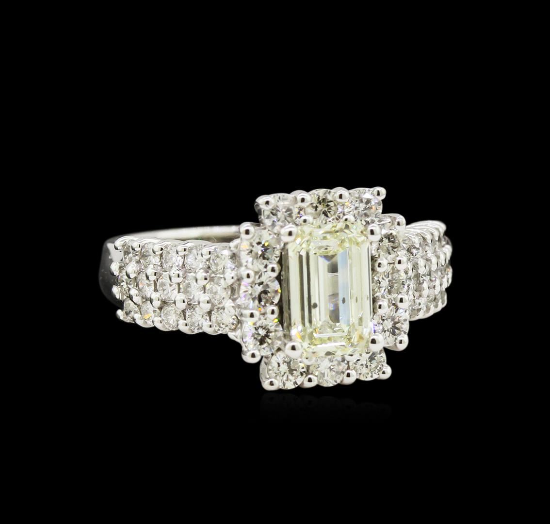 One electronically tested 14KT white gold lady's cast wedding ring with a basket halo with a bright polish finish. The featured lady's ring has a shank measuring 2.73 millimeters wide. Identified with markings of "14K". Condition is new, good workmanship. Containing: One prong set emerald cut diamond, measuring 7.50 x 4.77 x 2.80mm (depth est.) , 5.00.%. GTCF approximate weight of 1.05ct. Graded in the setting. Clarity: SI-1. Color: M - N. Cut Very Good Twelve prong set round brilliant cut diamonds, measuring 2.40 - 2.30 x 1.41mm (depth est.) approximate total weight of 12 Stones = 0.56ct. Graded in the setting. Clarity: SI-1 to I-1. Color: H - I. Cut Good Thirty prong set round brilliant cut diamonds, measuring 1.60 - 1.55 x 1.03mm (depth est.) approximate total weight of 30 Stones = 0.48ct. Graded in the setting. Clarity: SI-1 to I-1. Color: H - I. Cut Good. Total Weight of Diamonds 2.09ct. Total Weight of Ring 5.00gm. GAS Appraised at $11,580.00.