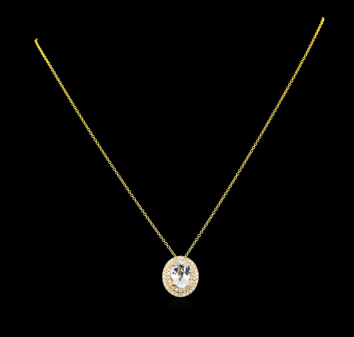 One electronically tested 14KT yellow gold lady's combination cast & assembled fashion pendant & chain 18.0" long, 1.3mm round cable link with a spring ring clasp with a basket double halo with a bright polish finish. Trademark is Orianne. Identified with markings of "14K". Condition is new, good workmanship. Containing: One prong set oval modified brilliant cut natural aquamarine, measuring 10.58 x 7.78 x 4.65mm, approximate weight of 2.10 ct., clarity is slightly included, type I, light, very slightly grayish, very slightly greenish blue color, (GIA vslgB 3/3), cut is good. Transmitting light with no distortion, transparent. Colored gemstones are presumed to have been subjected to commonly used enhancement processes. Graded in the setting. Fifty prong set round brilliant cut diamonds, measuring 1.40 - 1.30 x 0.82mm (depth est.) approximate total weight of 50 Stones = 0.46ct. Graded in the setting. Clarity: I-1 to I-2. Color: H - I. Cut Good. Total Weight of Colored Stones 2.10 ct. Total Weight of Diamonds 0.46ct. Total Weight of Pendant & Chain 5.20gm. GAS Appraised.