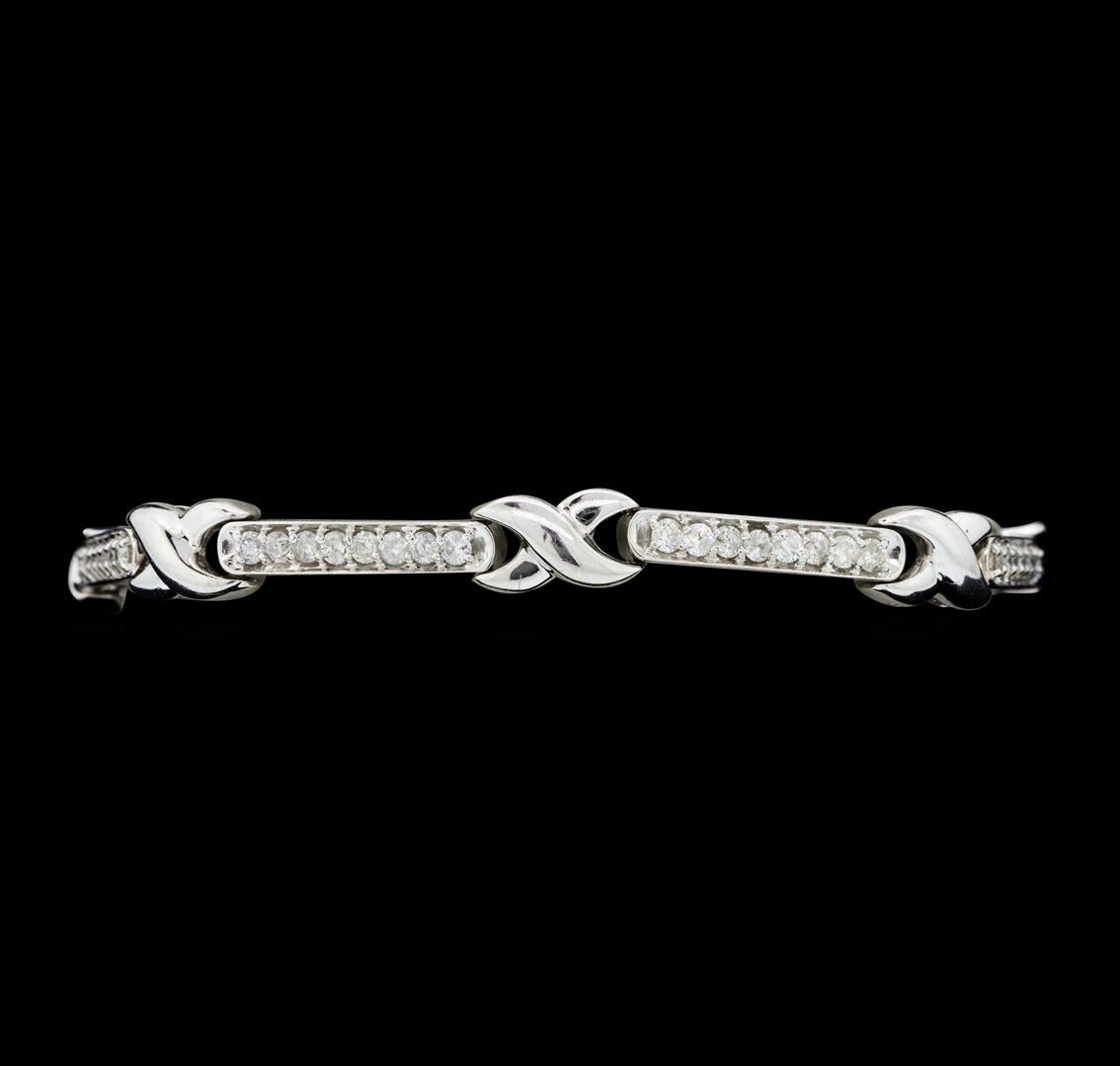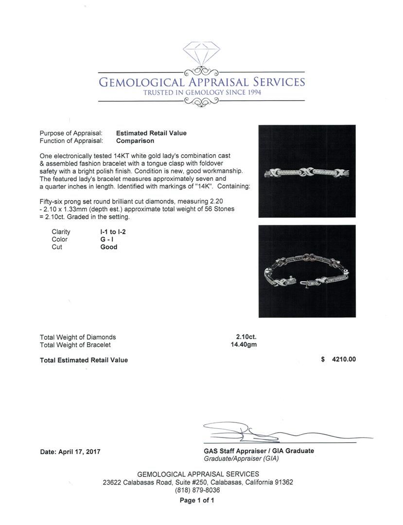 One electronically tested 14KT white gold lady's combination cast & assembled fashion bracelet with a tongue clasp with foldover safety with a bright polish finish. The featured lady's bracelet measures approximately seven and a quarter inches in length. Identified with markings of '14K'. Condition is new, good workmanship. Containing: Fifty-Six prong set round brilliant cut diamonds, measuring 2.20 - 2.10 x 1.33mm (depth est.) approximate total weight of 56 Stones = 2.10ct. Graded in the setting. Color G - I Clarity I-1 to I-2 Cut Good. Total Weight of Diamonds 2.10ct.. Total Weight of Bracelet 14.40gm GAS Appraised at $4210.00. GAS Appraised at $4,210.00.
