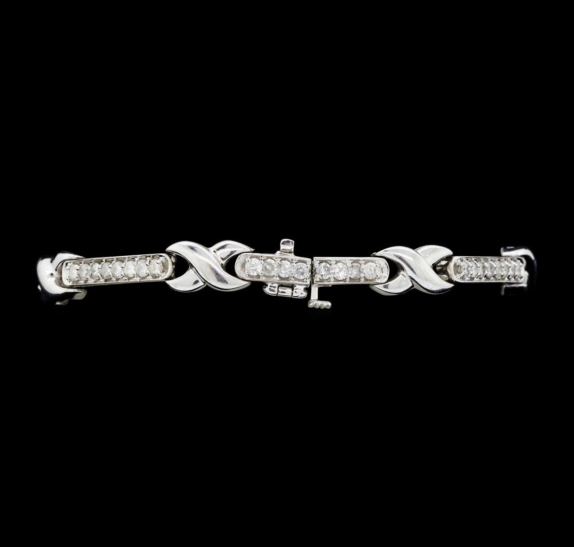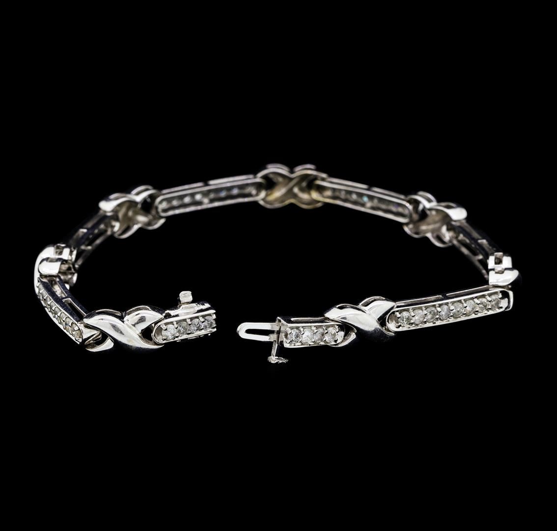 One electronically tested 14KT white gold lady's combination cast & assembled fashion bracelet with a tongue clasp with foldover safety with a bright polish finish. The featured lady's bracelet measures approximately seven and a quarter inches in length. Identified with markings of '14K'. Condition is new, good workmanship. Containing: Fifty-Six prong set round brilliant cut diamonds, measuring 2.20 - 2.10 x 1.33mm (depth est.) approximate total weight of 56 Stones = 2.10ct. Graded in the setting. Color G - I Clarity I-1 to I-2 Cut Good. Total Weight of Diamonds 2.10ct.. Total Weight of Bracelet 14.40gm GAS Appraised at $4210.00. GAS Appraised at $4,210.00.