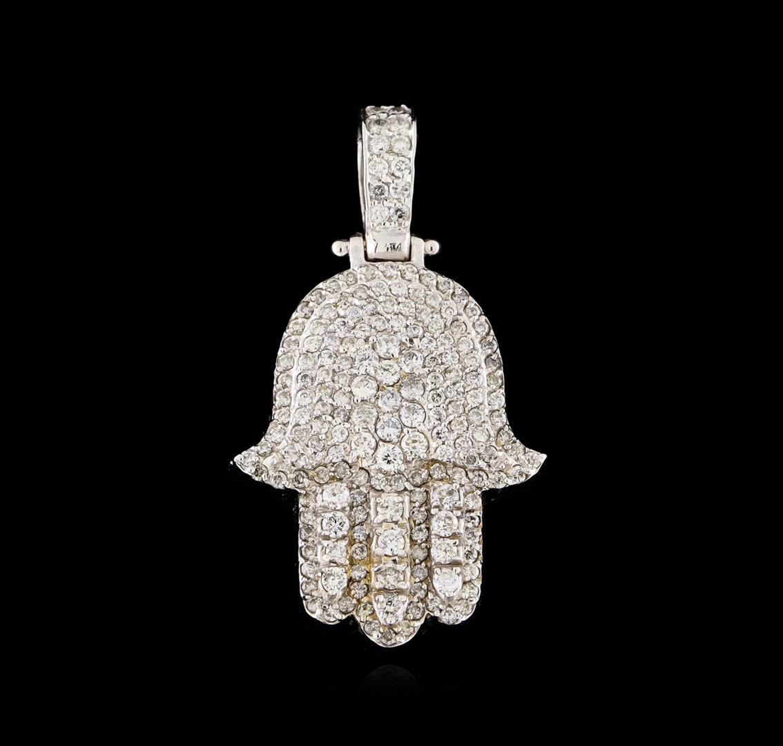 One electronically tested 14KT white gold cast & assembled diamond "hamsa" pendant with a bright polish finish. The pendant features a diamond encrusted hamsa motif, completed by a diamond set bail. Area measurements with bail 1.62 x 0.87 inch. In all faiths the hamsa is a protective sign. It is believed that wearing hamsa jewelry brings the owner happiness, luck, health, and good fortune. Condition is new, good workmanship. Containing: Twenty-Five prong set round brilliant cut diamonds, measuring 2.00 - 1.90 x 1.17mm (depth est.) approximate total weight of 25 Stones = 0.75ct. Graded in the setting. Clarity: I-1 to I-2. Color: G - I Twelve prong set round brilliant cut diamonds, measuring 1.70 - 1.60 x 0.99mm (depth est.) approximate total weight of 12 Stones = 0.24ct. Graded in the setting. Clarity: I-1 to I-2. Color: G - I One Hundred Forty-Three prong set round brilliant cut diamonds, measuring 1.30 - 1.20 x 0.75mm (depth est.) approximate total weight of 143 Stones = 1.11ct. Graded in the setting. Clarity: I-1 to I-2. Color: G - I. Total Weight of Diamonds 2.10ct. Total Weight of Pendant 13.39gm. AIG Appraised at $7,355.00.