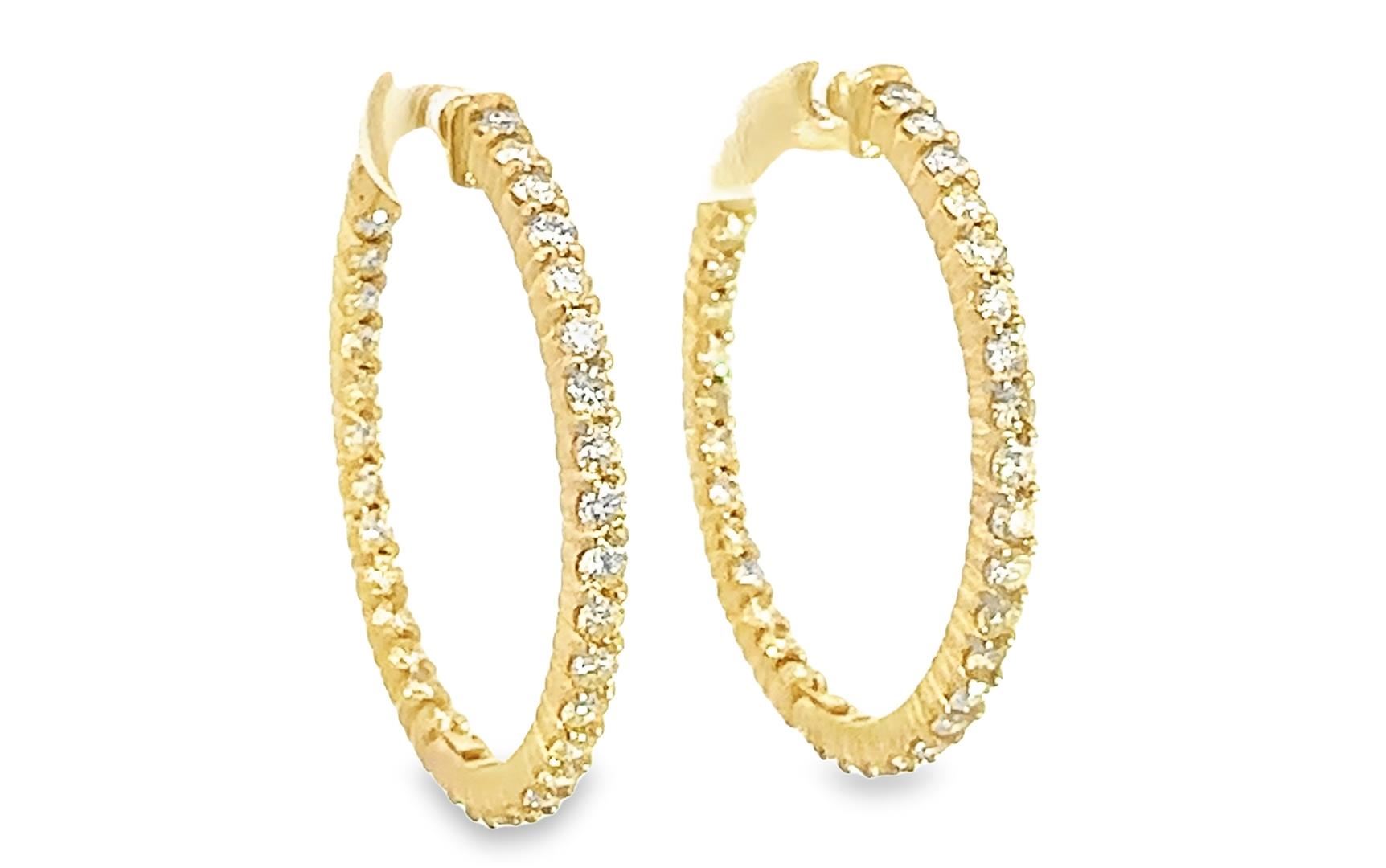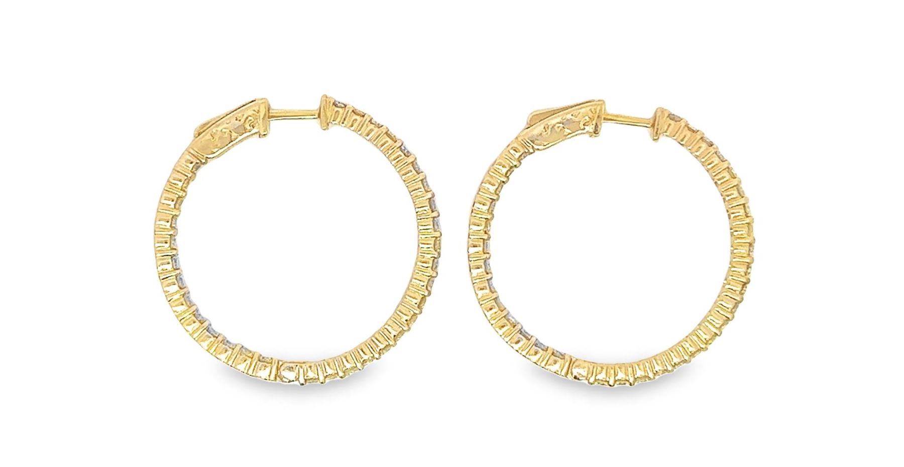 One pair electronically tested 14KT yellow gold lady's combination cast & assembled fashion inside-out hoop earrings with a bright polish finish. The featured hoop earring has a diameter of 30 millimeter. Identified with markings of "14K". Condition is new, good workmanship. Containing: Sixty-Six prong set round brilliant cut diamonds, measuring 2.00 - 1.95 x 1.28mm (depth est.) approximate total weight of 66 Stones = 2.10ct. Graded in the setting. Color I - K Clarity VS-2 to SI-1 Cut Very Good Total Weight of Diamonds 2.10ct. Total Weight of Earrings 7.70gm Estimated Retail Value $ 7550.00