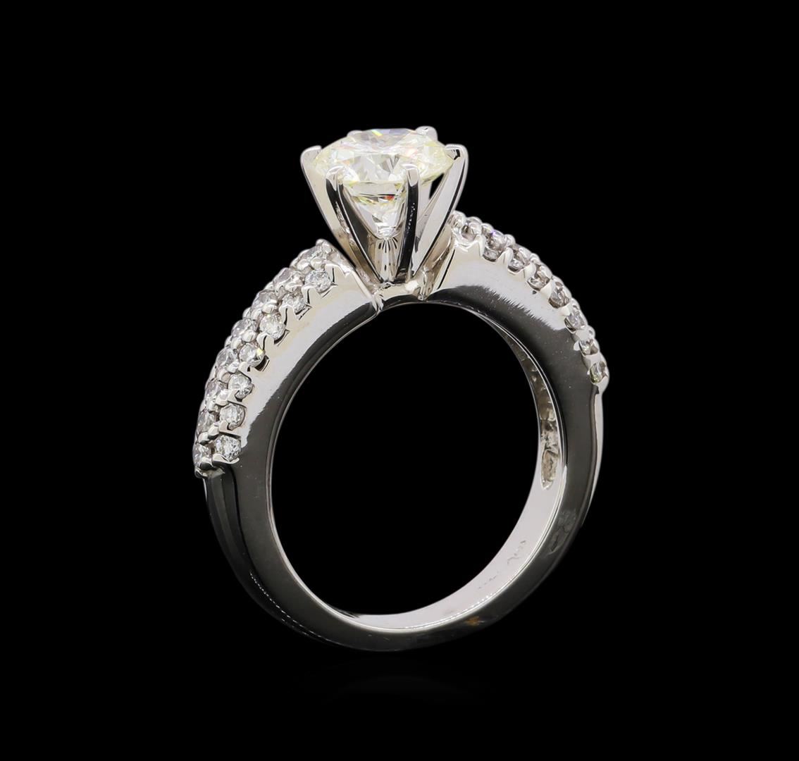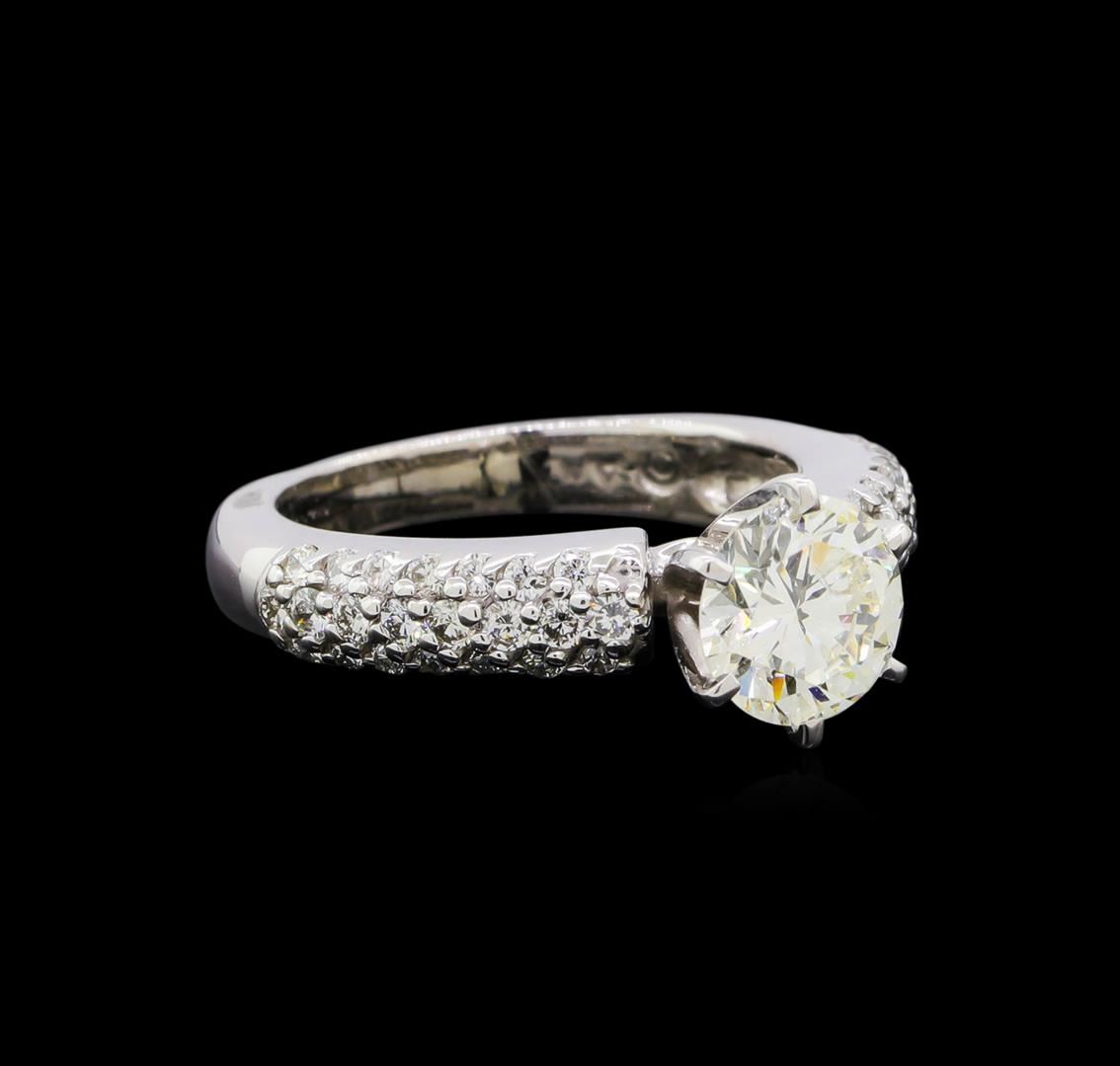 One 14KT white gold lady's engagement style ring weighing 5.55 grams containing one center diamond with SI clarity and H-I color weighing 1.20ct and adjacent diamonds with SI clarity and G-H color weighing 0.90ctw.