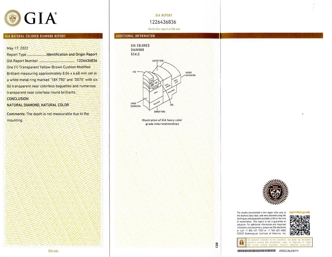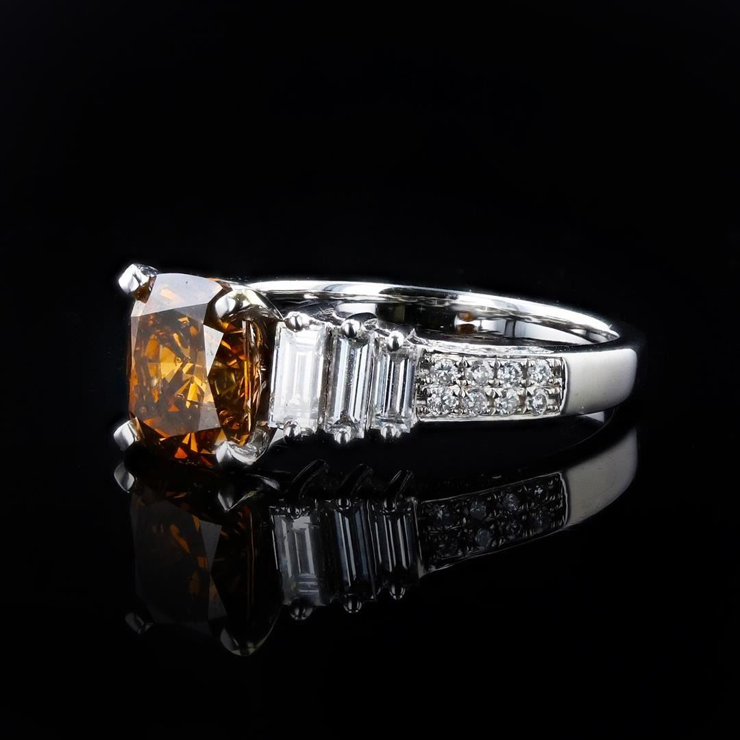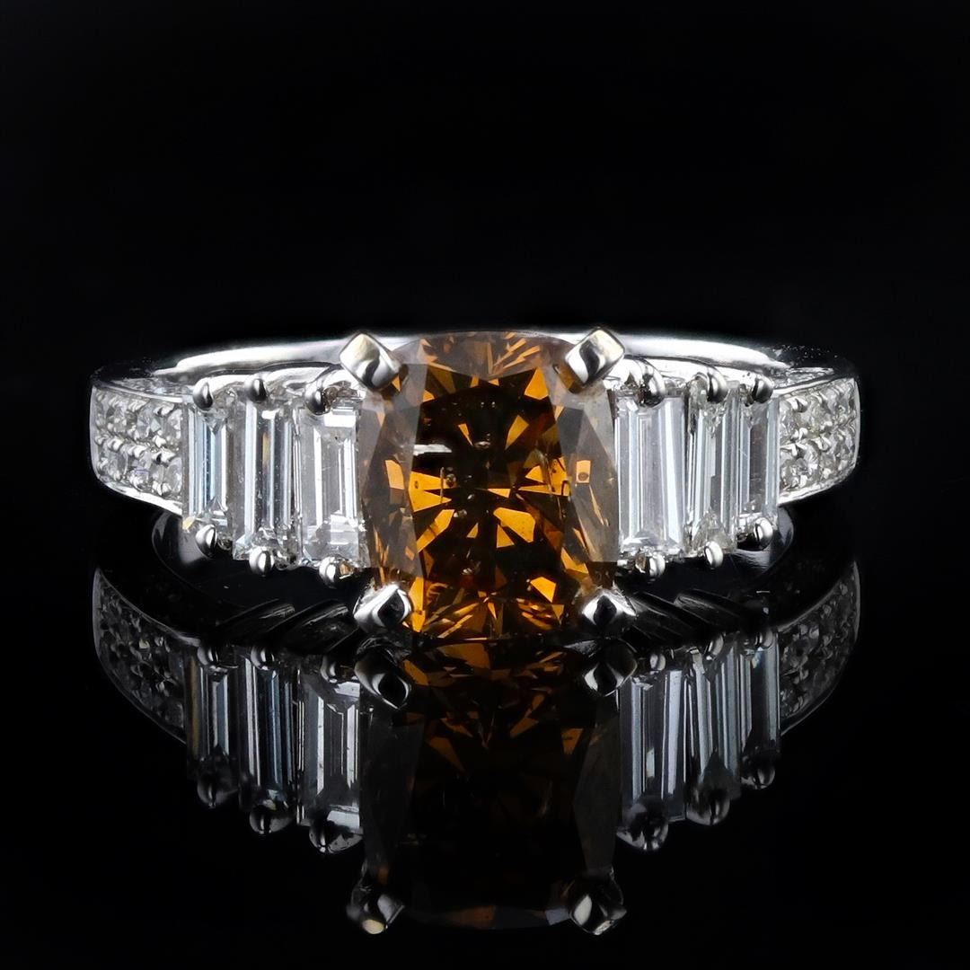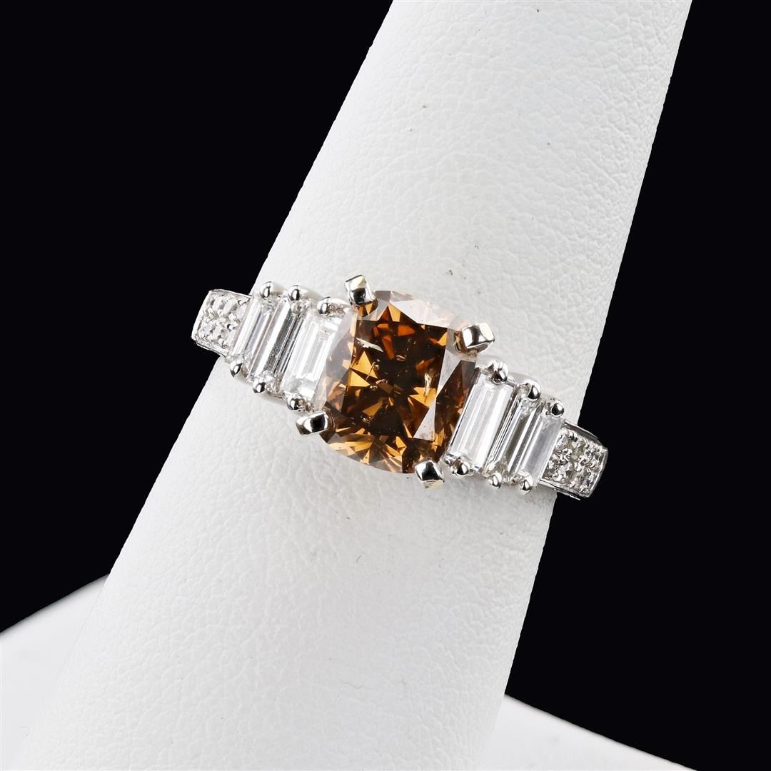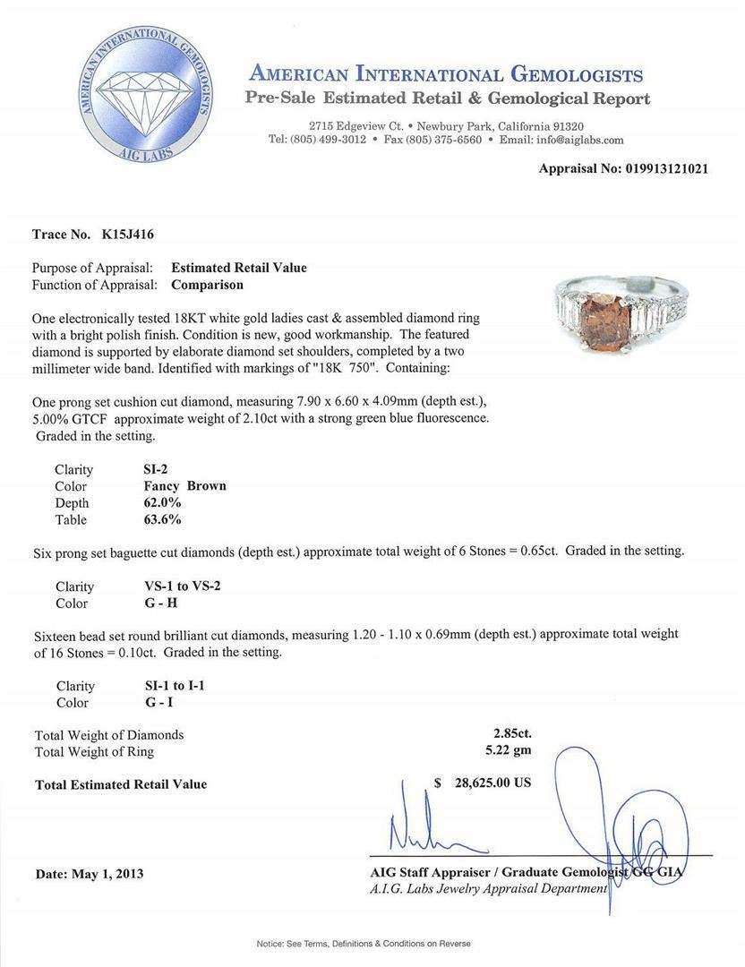2.10ct Fancy Brown SI2 CLARITY CENTER Diamond 18K White Gold Ring (GIA CERTIFIED) 2.85ctw Diamonds. One electronically tested 18KT white gold ladies cast & assembled diamond ring with a bright polish finish. Condition is new, good workmanship. The featured diamond is supported by elaborate diamond set shoulders, completed by a two millimeter wide band. Identified with markings of "18K 750" One prong set cushion cut diamond, measuring 7.90 x 6.60 x 4.09mm (depth est.), 5.00% GTCF approximate weight of 2.10ct with a strong green blue fluorescence. Graded in the setting Clarity SI-2 Color Fancy Brown Depth 62.0% Table 63.6% Six prong set baguette cut diamonds (depth est.) approximate total weight of 6 Stones = 0.65ct. Graded in the setting Clarity VS-1 to VS-2 Color G - H Sixteen bead set round brilliant cut diamonds, measuring 1.20 - 1.10 x 0.69mm (depth est.) approximate total weight of 16 Stones = 0.10ct. Graded in the setting Clarity SI-1 to I-1 Color G - I Total Weight of Diamonds 2.85ct. Total Weight of Ring 5.22 gm