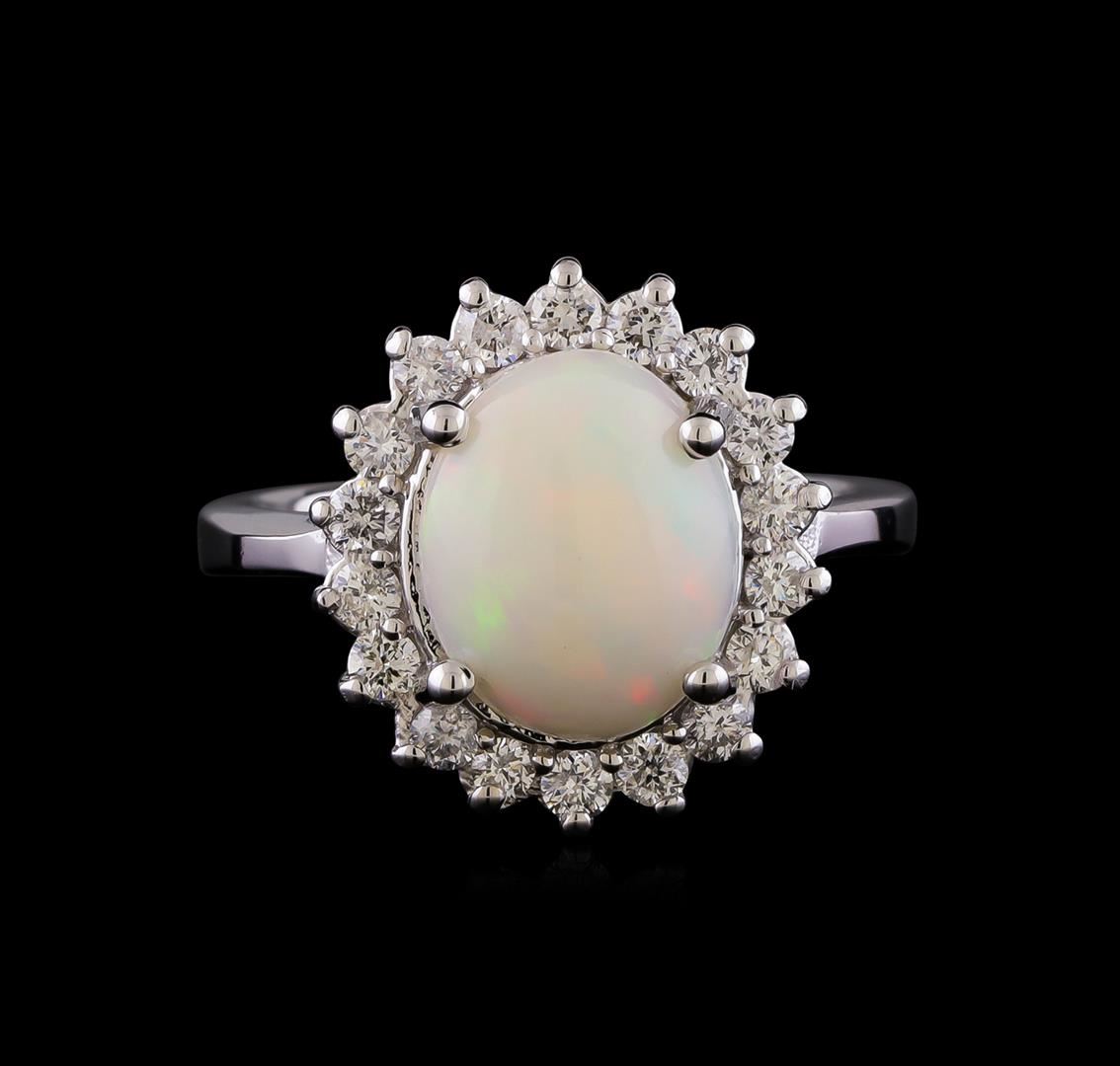 One ring : 14KT white gold weighing 5.56gm containing one opal center stone with a total weight of 2.10ct. and side diamonds weighing 0.60ctw.