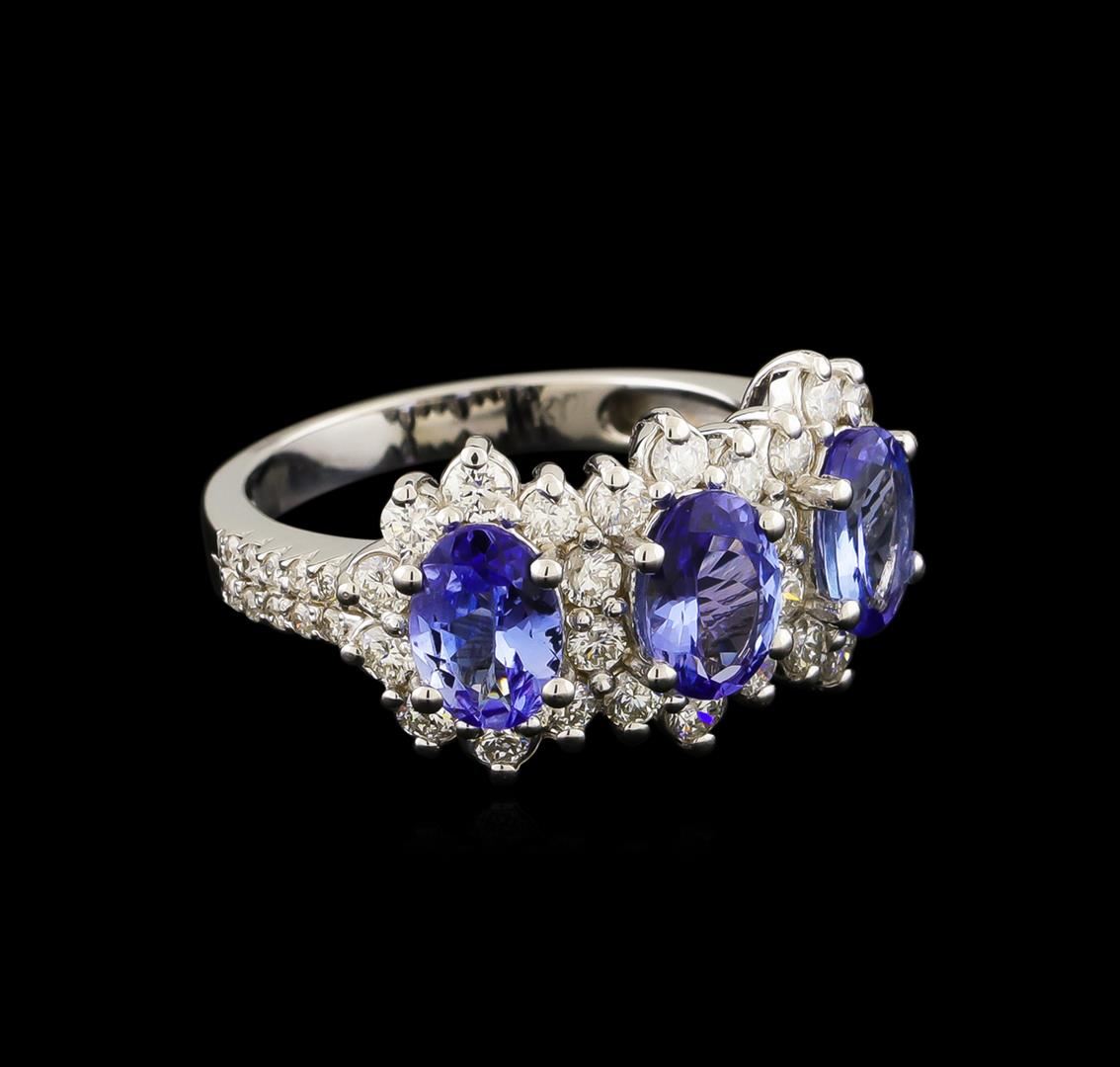 One electronically tested 14KT white gold lady's cast 3-stone halo ring with a bright polish finish. The featured lady's ring has a shank measuring 2.60 millimeters wide. Identified with markings of "K14". Condition is new, good workmanship. Containing: Three prong set oval modified brilliant cut natural tanzanites, measuring 7.02 x 5.00 x 2.78mm, approximate total weight of 2.10ct., clarity is eye clean, medium light, very slightly grayish, bluish violet color, (GIA bV 4/3), cut is very good. Transmitting light with no distortion, transparent. Colored gemstones are presumed to have been subjected to commonly used enhancement processes. Graded in the setting. Twenty-Six prong set round brilliant cut diamonds, measuring 2.10 - 2.00 x 1.27mm (depth est.) approximate total weight of 26 Stones = 0.85ct. Graded in the setting. Clarity: SI-1 to SI-2. Color: H - I. Cut Very Good Twenty prong set round brilliant cut diamonds, measuring 1.35 - 1.25 x 0.78mm (depth est.) approximate total weight of 20 Stones = 0.16ct. Graded in the setting. Clarity: SI-1 to I-1. Color: H - I. Cut Good. Total Weight of Colored Stones 2.10ct. Total Weight of Diamonds 1.01ct. Total Weight of Ring 5.00gm. GAS Appraised at $4,340.00.