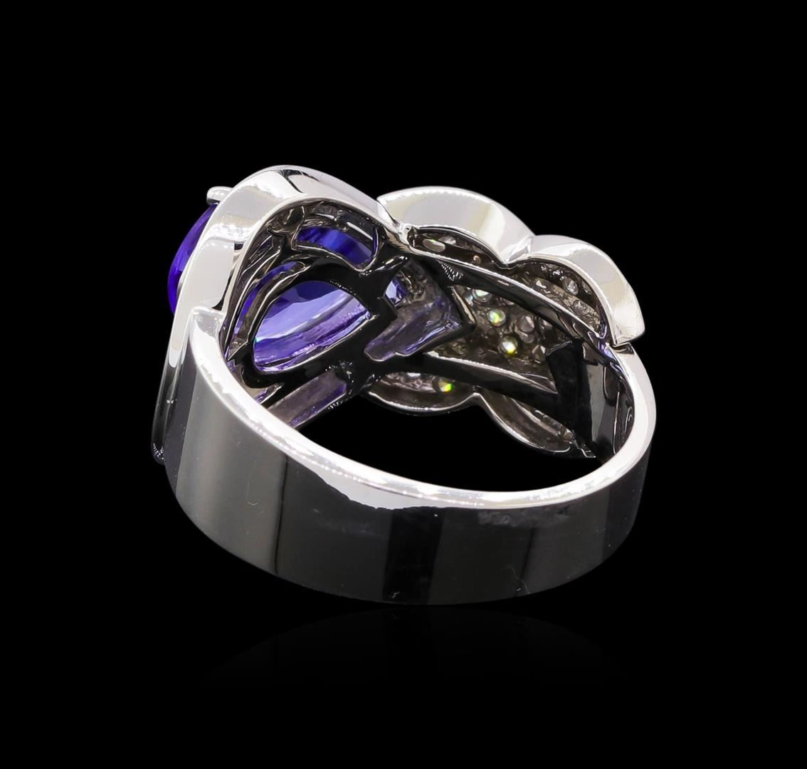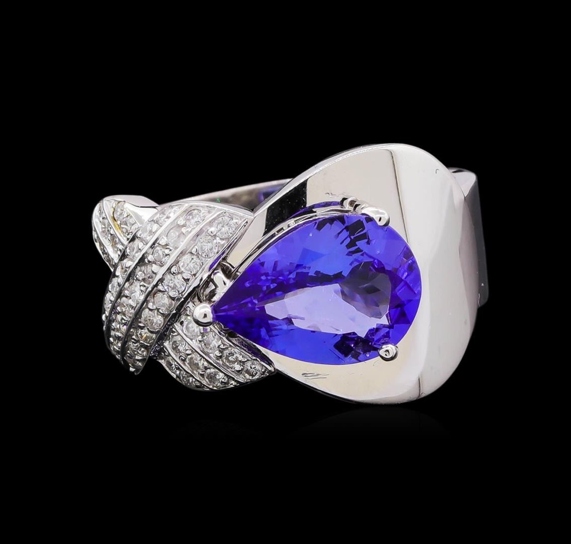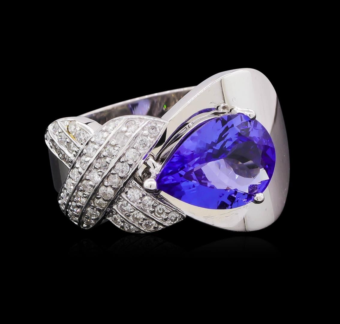 One electronically tested 14KT white gold lady's cast fashion ring with a bright polish finish. The featured lady's ring has a shank measuring 4.62 millimeters in width. Identified with markings of "K14". Condition is new, good workmanship. Containing: Forty-Five prong set round brilliant cut diamonds, measuring 1.20 - 1.15 x 0.72mm (depth est.) approximate total weight of 45 Stones = 0.28ct. Graded in the setting. Clarity: SI-1 to I-1. Color: H - I. Cut Good One prong set pear brilliant cut natural tanzanite, measuring 11.20 x 7.74 x 4.11mm, (depth est.) approximate weight of 2.10 ct., clarity is eye clean, medium, moderately strong, bluish violet color, (GIA bV 5/4), cut is very good. Transmitting light with no distortion, transparent. Colored gemstones are presumed to have been subjected to commonly used enhancement processes. Graded in the setting. Total Weight of Colored Stones 2.10 ct. Total Weight of Diamonds 0.28ct. Total Weight of Ring 6.80gm. GAS Appraised.