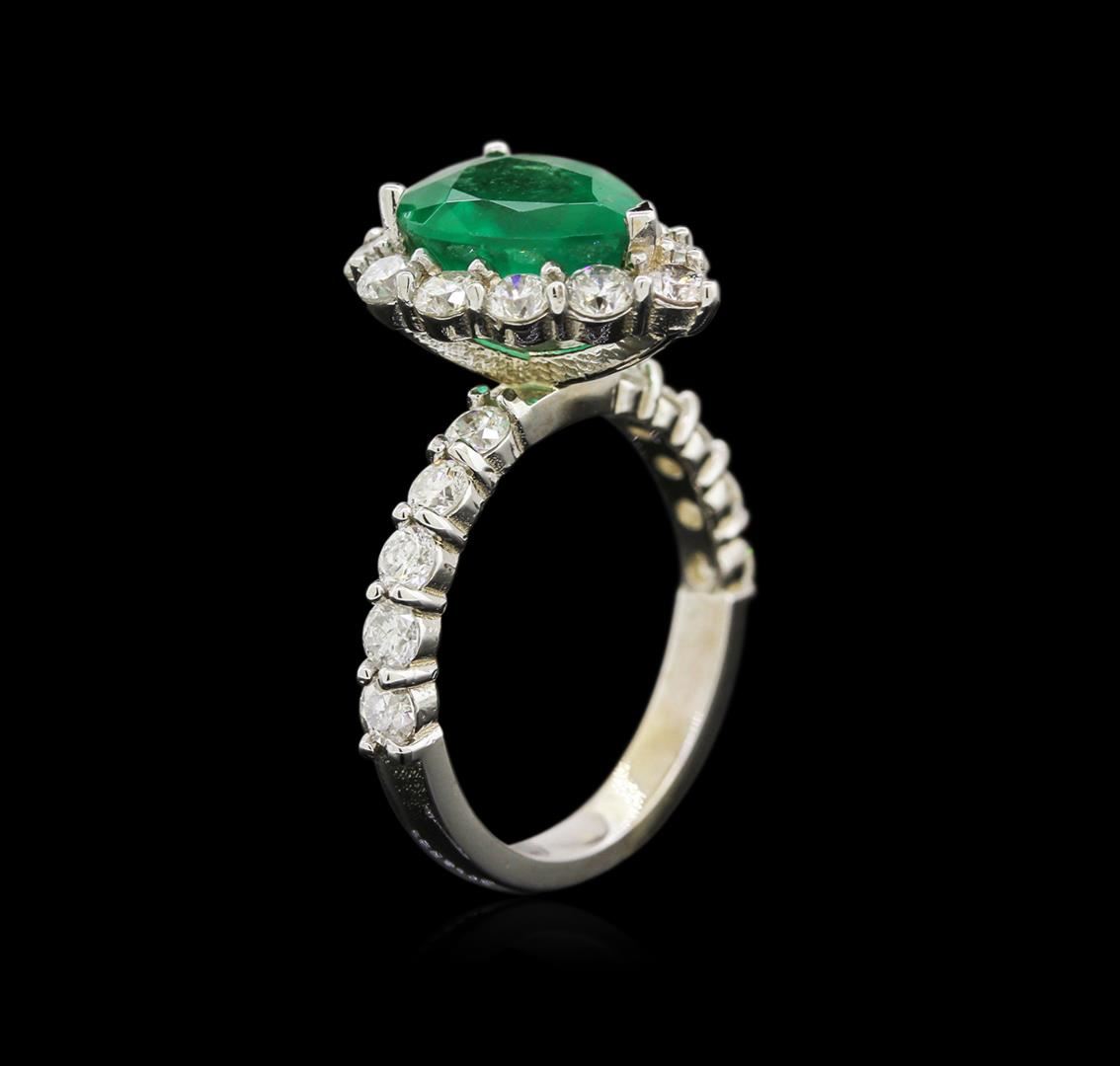 One electronically tested 14KT white gold lady's cast fashion ring with a halo with a bright polish finish. The featured lady's ring has a shank measuring 2.50 millimeters wide. Identified with markings of "14K". Condition is new, good workmanship. Containing: One prong set pear modified brilliant cut natural emerald, measuring 10.00 x 7.72 x 5.10mm, approximate weight of 2.10ct., clarity is heavily included, type III, medium dark, moderately strong, very slightly bluish green color, (GIA vslbG 6/4), cut is good. Transmitting light somewhat diffusely, semi-transparent to translucent. Naturally occurring internal & external characteristics are present. Indications of oil residue. Graded in the setting. Twenty-Two shared prong set round brilliant cut diamonds, measuring 2.60 - 2.55 x 1.60mm (depth est.) approximate total weight of 22 Stones = 1.42ct. Graded in the setting. Clarity: SI-2 to I-1. Color: G - Good. Total Weight of Colored Stones 2.10ct. Total Weight of Diamonds 1.42ct. Total Weight of Ring 4.80gm. GAS Appraised at $7,585.00.