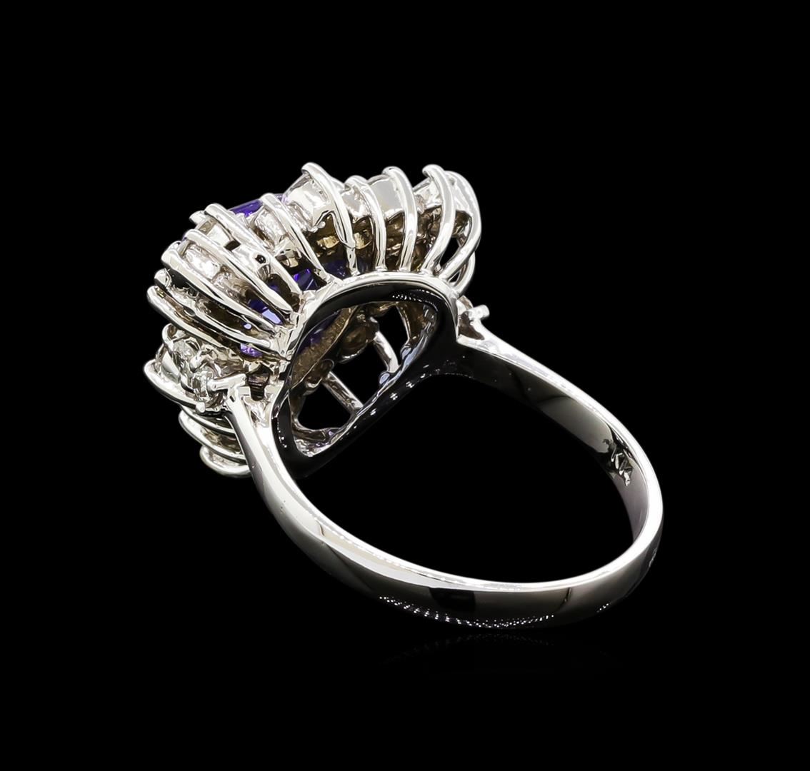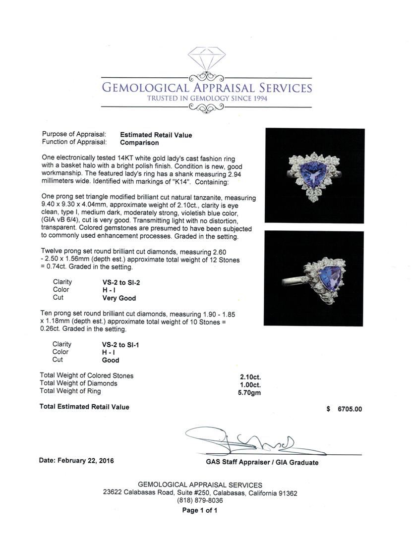 One electronically tested 14KT white gold lady's cast fashion ring with a basket halo with a bright polish finish. The featured lady's ring has a shank measuring 2.94 millimeters wide. Identified with markings of "K14". Condition is new, good workmanship. Containing: One prong set triangle modified brilliant cut natural tanzanite, measuring 9.40 x 9.30 x 4.04mm, approximate weight of 2.10ct., clarity is eye clean, type I, medium dark, moderately strong, violetish blue color, (GIA vB 6/4), cut is very good. Transmitting light with no distortion, transparent. Colored gemstones are presumed to have been subjected to commonly used enhancement processes. Graded in the setting. Twelve prong set round brilliant cut diamonds, measuring 2.60 - 2.50 x 1.56mm (depth est.) approximate total weight of 12 Stones = 0.74ct. Graded in the setting. Clarity: VS-2 to SI-2. Color: H - I. Cut Very Good Ten prong set round brilliant cut diamonds, measuring 1.90 - 1.85 x 1.18mm (depth est.) approximate total weight of 10 Stones = 0.26ct. Graded in the setting. Clarity: VS-2 to SI-1. Color: H - I. Cut Good. Total Weight of Colored Stones 2.10ct. Total Weight of Diamonds 1.00ct. Total Weight of Ring 5.70gm. GAS Appraised at $6,705.00.