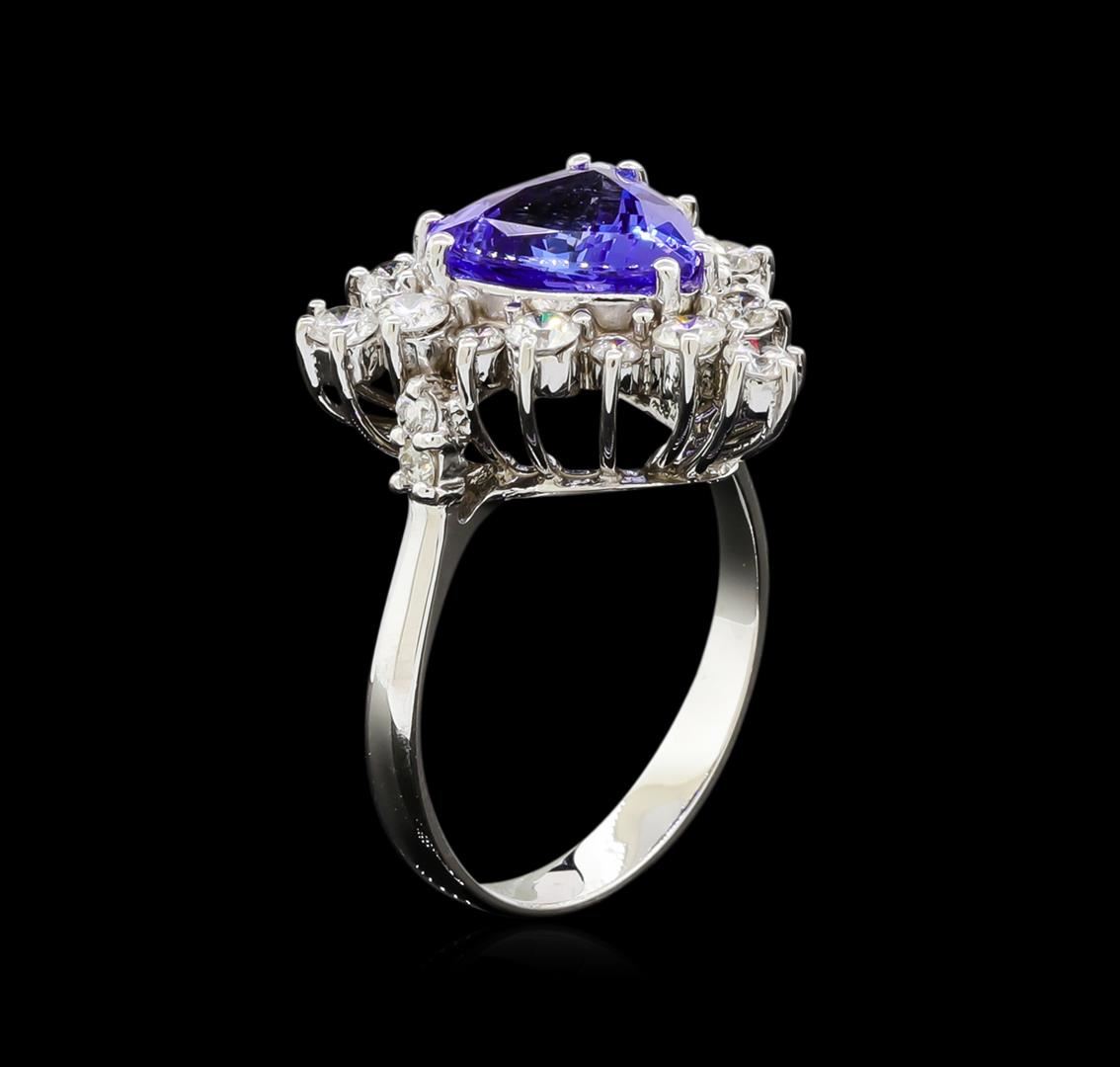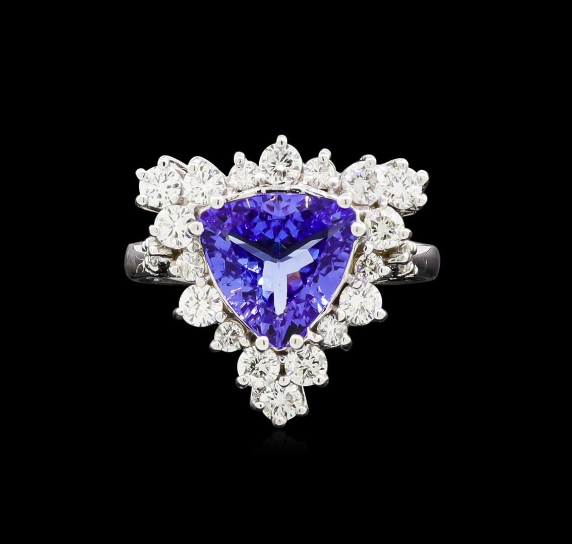 One electronically tested 14KT white gold lady's cast fashion ring with a basket halo with a bright polish finish. The featured lady's ring has a shank measuring 2.94 millimeters wide. Identified with markings of "K14". Condition is new, good workmanship. Containing: One prong set triangle modified brilliant cut natural tanzanite, measuring 9.40 x 9.30 x 4.04mm, approximate weight of 2.10ct., clarity is eye clean, type I, medium dark, moderately strong, violetish blue color, (GIA vB 6/4), cut is very good. Transmitting light with no distortion, transparent. Colored gemstones are presumed to have been subjected to commonly used enhancement processes. Graded in the setting. Twelve prong set round brilliant cut diamonds, measuring 2.60 - 2.50 x 1.56mm (depth est.) approximate total weight of 12 Stones = 0.74ct. Graded in the setting. Clarity: VS-2 to SI-2. Color: H - I. Cut Very Good Ten prong set round brilliant cut diamonds, measuring 1.90 - 1.85 x 1.18mm (depth est.) approximate total weight of 10 Stones = 0.26ct. Graded in the setting. Clarity: VS-2 to SI-1. Color: H - I. Cut Good. Total Weight of Colored Stones 2.10ct. Total Weight of Diamonds 1.00ct. Total Weight of Ring 5.70gm. GAS Appraised at $6,705.00.