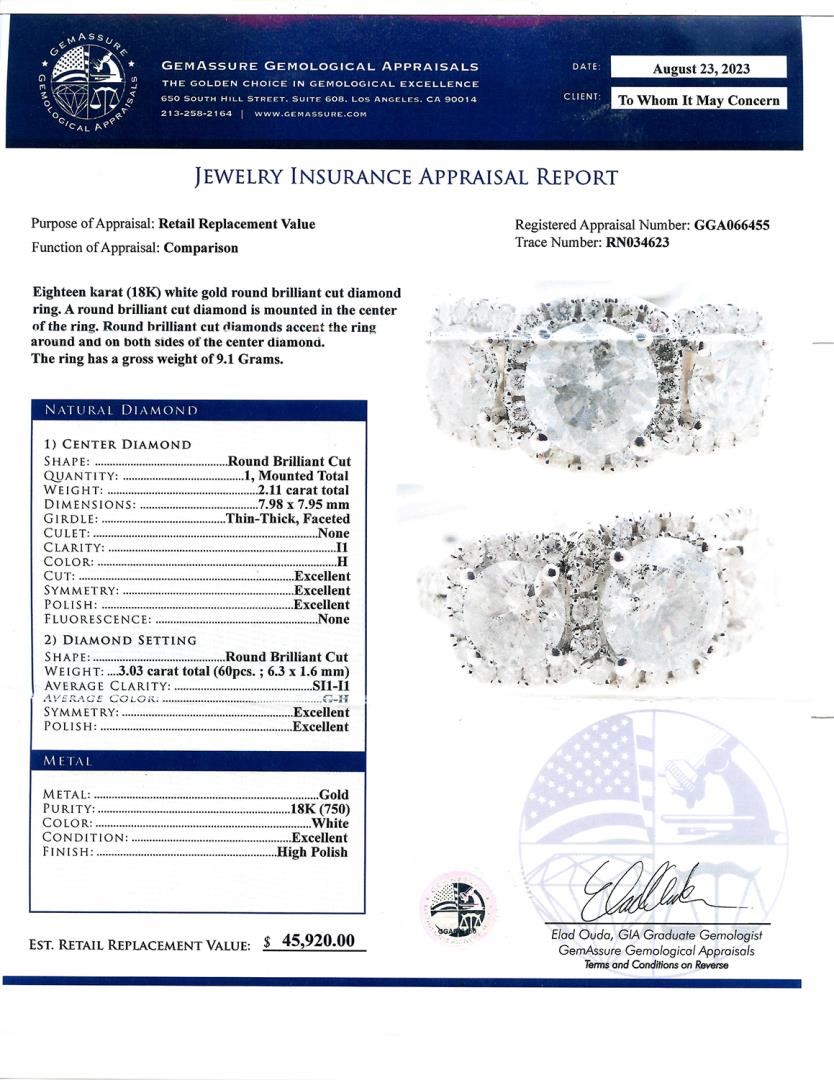Eighteen karat (18K) white gold round brilliant cut diamond ring. A round brilliant cut diamond is mounted in the center of the ring. Round brilliant cut diamonds accent the ring around and on both sides of the center diamond. The ring has a gross weight of 9.1 Grams. #NATURAL DIAMOND# 1) CENTER DIAMOND SHAPE: Round Brilliant Cut QUANTITY: 1, Mounted Total WEIGHT: 2.11 carat total DIMENSIONS: 7.98 x 7.95mm GIRDLE: Thin-Thick, Faceted CULET: None CLARITY: I1 COLOR: H CUT: Excellent SYMMETRY: Excellent POLISH: Excellent FLUORESCENCE: None 2) DIAMOND SETTING SHAPE: Round Brilliant Cut WEIGHT: 3.03 carat total (60pcs. 6.3 x 1.6mm) AVERAGE CLARITY: SI1-I1 AVERAGE COLOR: G-H SYMMETRY: Excellent POLISH: Excellent #METAL# METAL: Gold PURITY: 18K (750) COLOR: White CONDITION: Excellent FINISH: High Polish