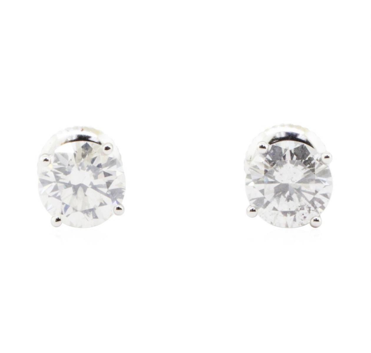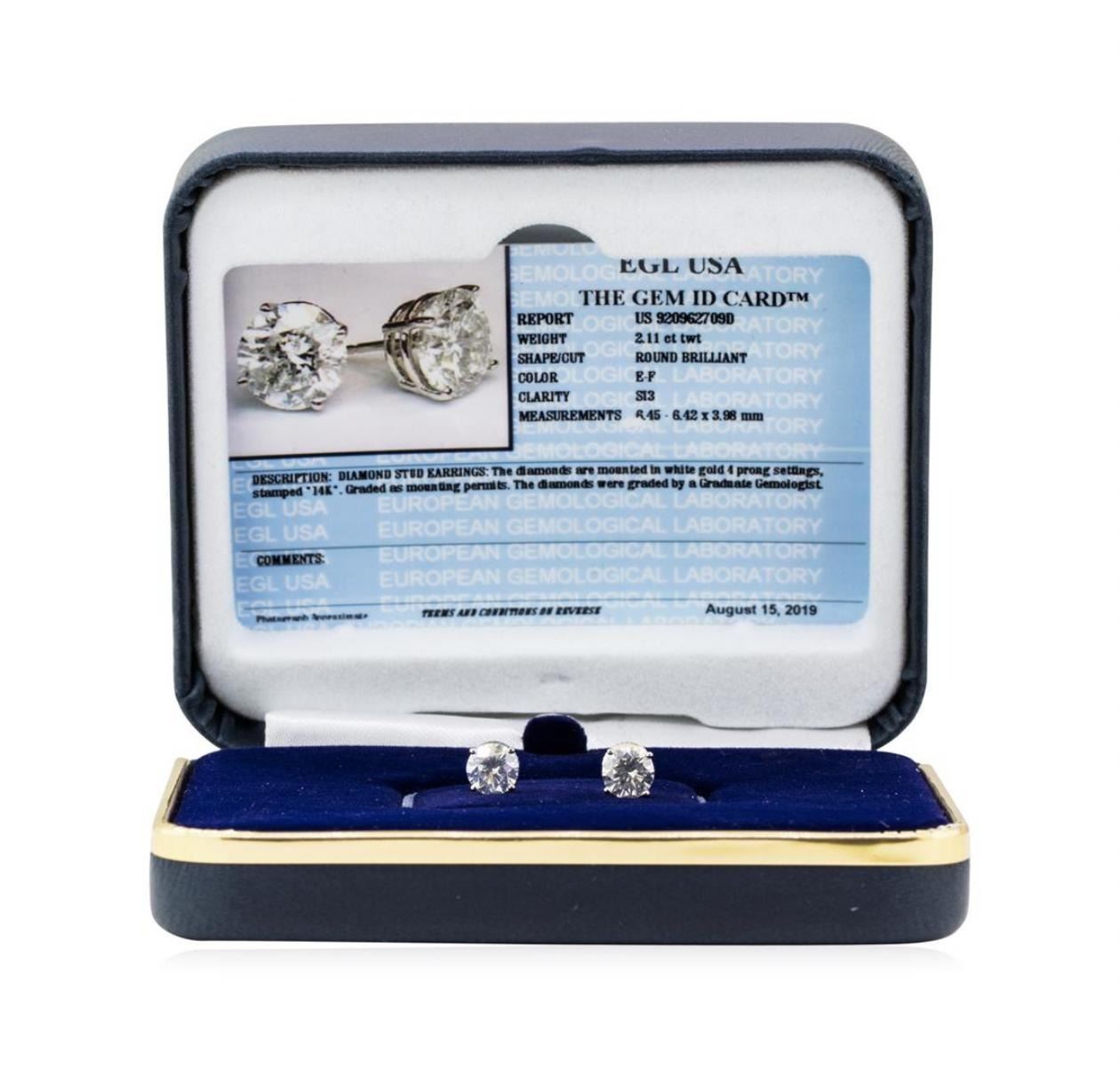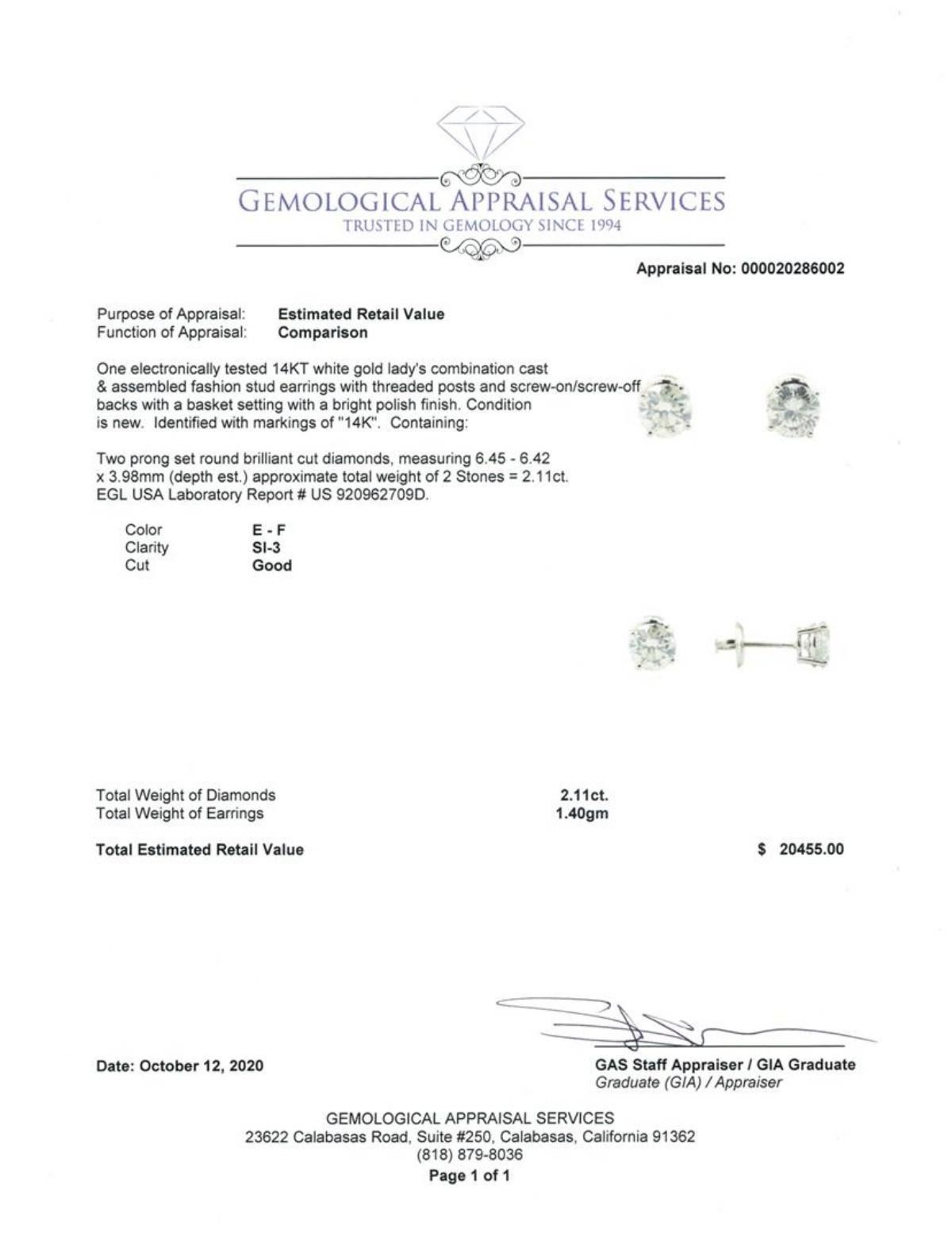 One electronically tested 14KT white gold lady's combination cast & assembled fashion stud earrings with threaded posts and screw-on/screw-off backs with a basket setting with a bright polish finish. Identified with markings of '14K'. Condition is new. Containing: Two prong set round brilliant cut diamonds, measuring 6.45 - 6.42 x 3.98mm (depth est.) approximate total weight of 2 Stones = 2.11ct. EGL USA Laboratory Report # US 920962709D. Color E - F Clarity SI-3 Cut Good. Total Weight of Diamonds 2.11ct.. Total Weight of Earrings 1.40gm GAS Appraised at $20455.00. GAS Appraised.