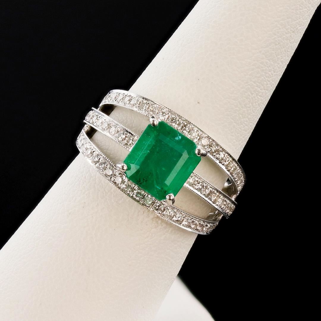 Eighteen karat (18K) white gold natural emerald beryl and diamond ring. An octagonal step cut natural emerald beryl gemstone is mounted in the center of the ring. Round brilliant cut diamonds accent the ring around and on both sides of the center gemstone. The ring has a gross weight of 6.4 Grams. #NATURAL GEMSTONE# GEMSTONE: Emerald Beryl NATURE: Natural SHAPE: Octagonal Step, Faceted Cut WEIGHT: 2.11 carat total DIMENSIONS: 8.01 X 7.47mm CLARITY: Type 3 COLOR: Green (5/5) SYMMETRY: Excellent COLOR INTENSITY: Intense TRANSPARENCY: Transparent TONE: Dark #NATURAL DIAMOND# SHAPE: Round Brilliant Cut WEIGHT: 0.62 carat total (66pcs.) DIMENSIONS: 1.4 x 1.3mm AVERAGE CLARITY: VS1-VS2 AVERAGE COLOR: F-G SYMMETRY: Excellent POLISH: Excellent #METAL# METAL: Gold PURITY: 18K(750) COLOR: White CONDITION: Excellent FINISH: High Polish Size: 6 1/2