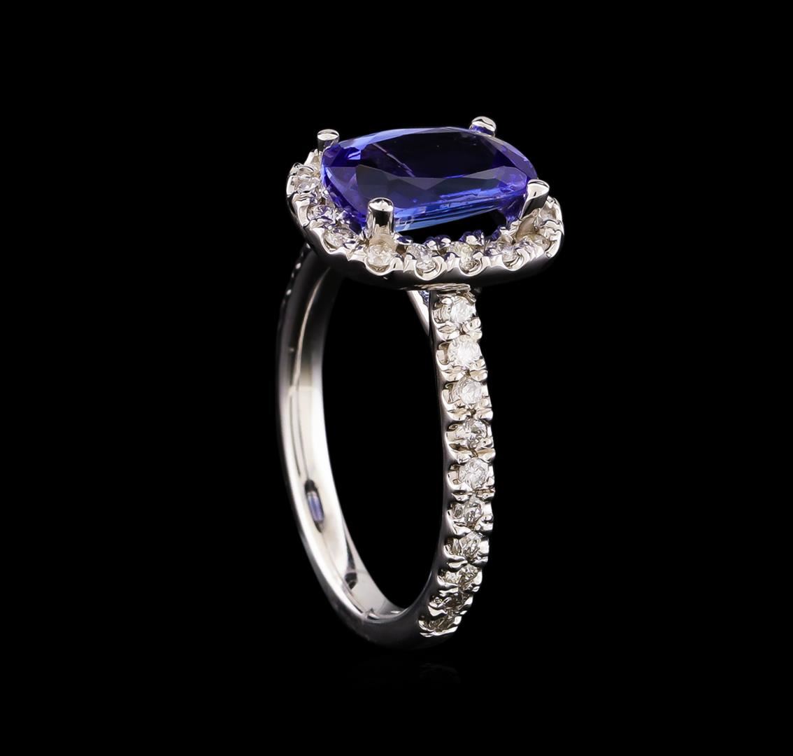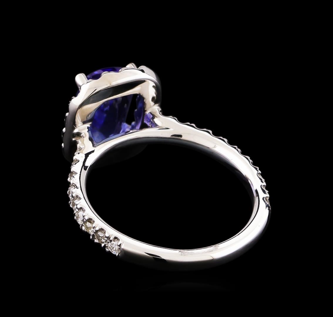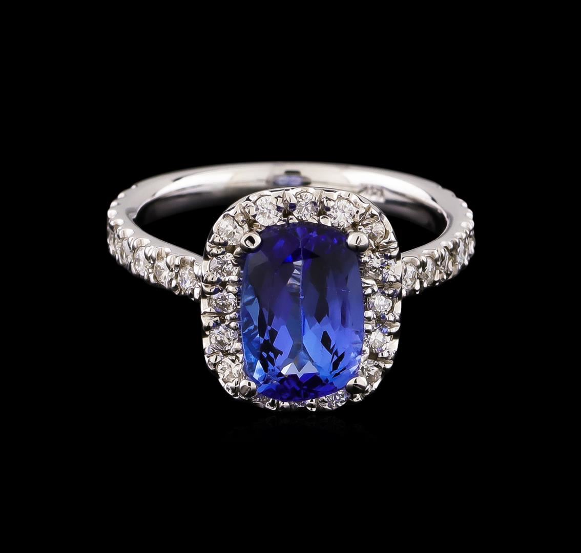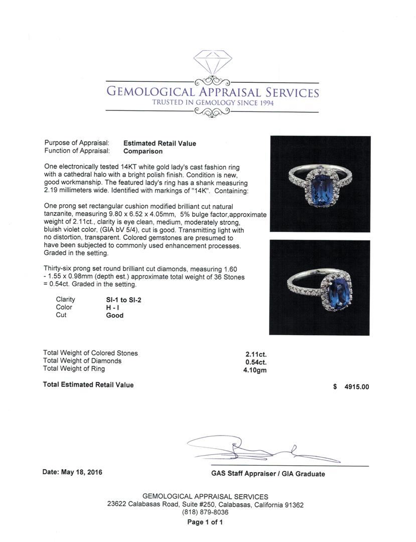 One electronically tested 14KT white gold lady's cast fashion ring with a cathedral halo with a bright polish finish. The featured lady's ring has a shank measuring 2.19 millimeters wide. Identified with markings of "14K". Condition is new, good workmanship. Containing: One prong set rectangular cushion modified brilliant cut natural tanzanite, measuring 9.80 x 6.52 x 4.05mm, 5%. bulge factor, approximate weight of 2.11ct., clarity is eye clean, medium, moderately strong, bluish violet color, (GIA bV 5/4), cut is good. Transmitting light with no distortion, transparent. Colored gemstones are presumed to have been subjected to commonly used enhancement processes. Graded in the setting. Thirty-Six prong set round brilliant cut diamonds, measuring 1.60 - 1.55 x 0.98mm (depth est.) approximate total weight of 36 Stones = 0.54ct. Graded in the setting. Clarity: SI-1 to SI-2. Color: H - I. Cut Good. Total Weight of Colored Stones 2.11ct. Total Weight of Diamonds 0.54ct. Total Weight of Ring 4.10gm. GAS Appraised at $4,915.00.