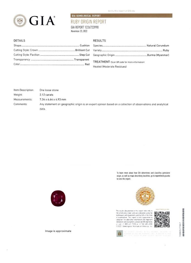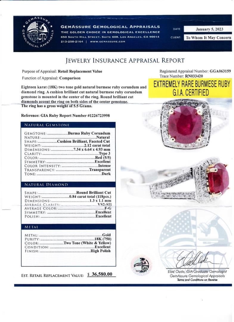 Eighteen karat (18K) two tone gold natural burmese ruby corundum and diamond ring. A cushion brilliant cut natural burmese ruby corundum gemstone is mounted in the center of the ring. Round brilliant cut diamonds accent the ring on both sides of the center gemstone. The ring has a gross weight of 5.5 Grams. Reference: GIA Ruby Report Number 1226723998 Brand: Hana #NATURAL GEMSTONE# GEMSTONE: Burma Ruby Corundum NATURE: Natural SHAPE: Cushion Brilliant, Faceted Cut WEIGHT: 2.12 carat total DIMENSIONS: 7.34 x 6.64 x 4.93mm CLARITY: Type 3 COLOR: Red (5/5) SYMMETRY: Excellent COLOR INTENSITY: Intense TRANSPARENCY: Transparent TONE: Dark #NATURAL DIAMOND# SHAPE: Round Brilliant Cut WEIGHT: 0.84 carat total (118pcs.) DIMENSIONS: 1.3 x 1.1mm AVERAGE CLARITY: VS2-SI1 AVERAGE COLOR: F-G SYMMETRY: Excellent POLISH: Excellent #METAL# METAL: Gold PURITY: 18K (750) COLOR: Two Tone (White & Yellow) CONDITION: Excellent FINISH: High Polish Size: 6 1/2
