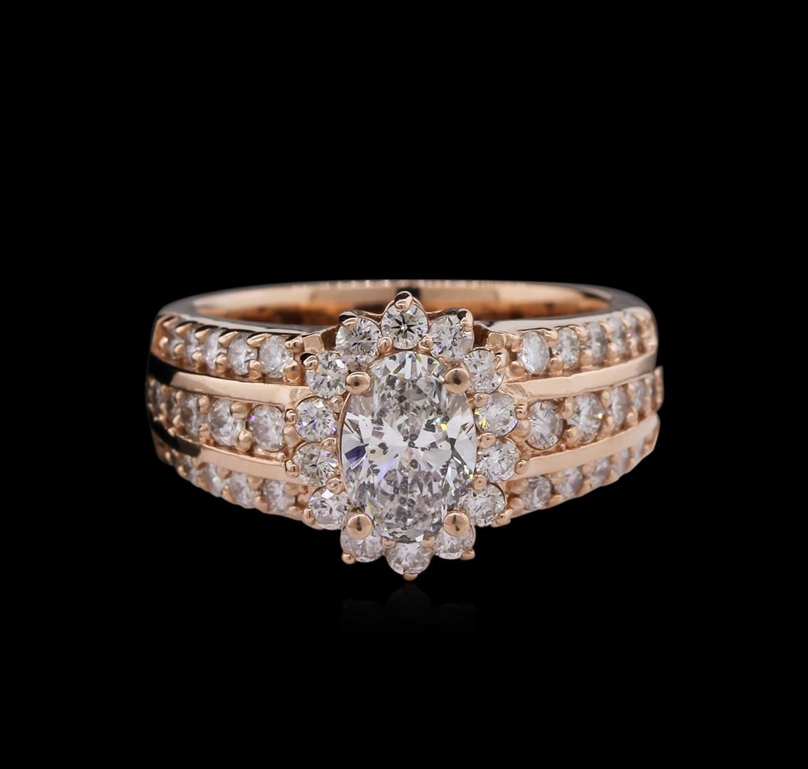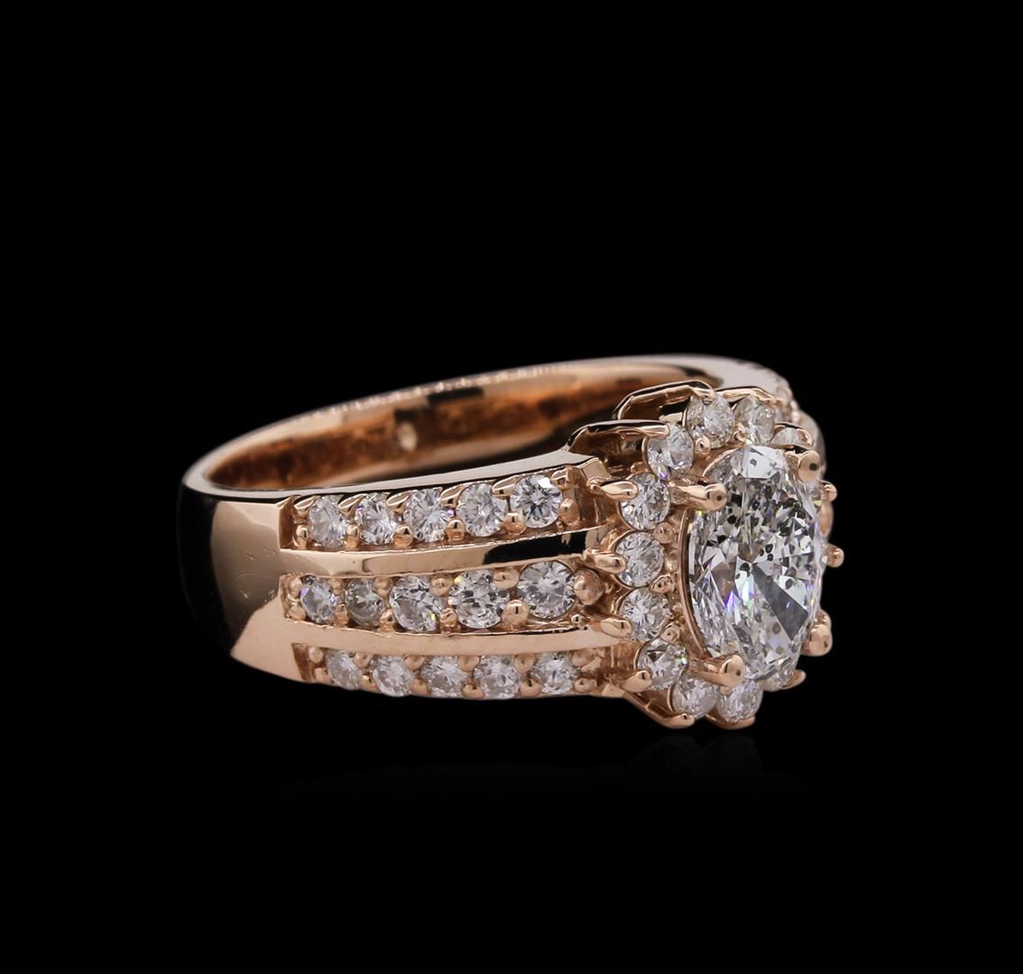 One electronically tested 14KT rose gold lady's cast wedding ring with a basket halo with a bright polish finish. The featured lady's ring has a shank measuring 4.48 millimeters wide. Identified with markings of "K14". Condition is new, good workmanship. Containing: One prong set oval shaped cut diamond, measuring 7.98 x 5.49 x 3.46mm (depth est.) , 5.00.%. GTCF approximate weight of 1.03ct. Graded in the setting. Clarity: I-1. Color: Good Thirty-Eight prong set round brilliant cut diamonds, measuring 2.00 - 1.80 x 1.14mm (depth est.) approximate total weight of 38 Stones = 0.89ct. Graded in the setting. Clarity: SI-1 to I-1. Color: H - I. Cut Good Six prong set round brilliant cut diamonds, measuring 2.10 - 2.05 x 1.27mm (depth est.) approximate total weight of 6 Stones = 0.20ct. Graded in the setting. Clarity: SI-1 to I-1. Color: H - I. Cut Good. Total Weight of Diamonds 2.12ct. Total Weight of Ring 8.10gm. GAS Appraised at $10,190.00.