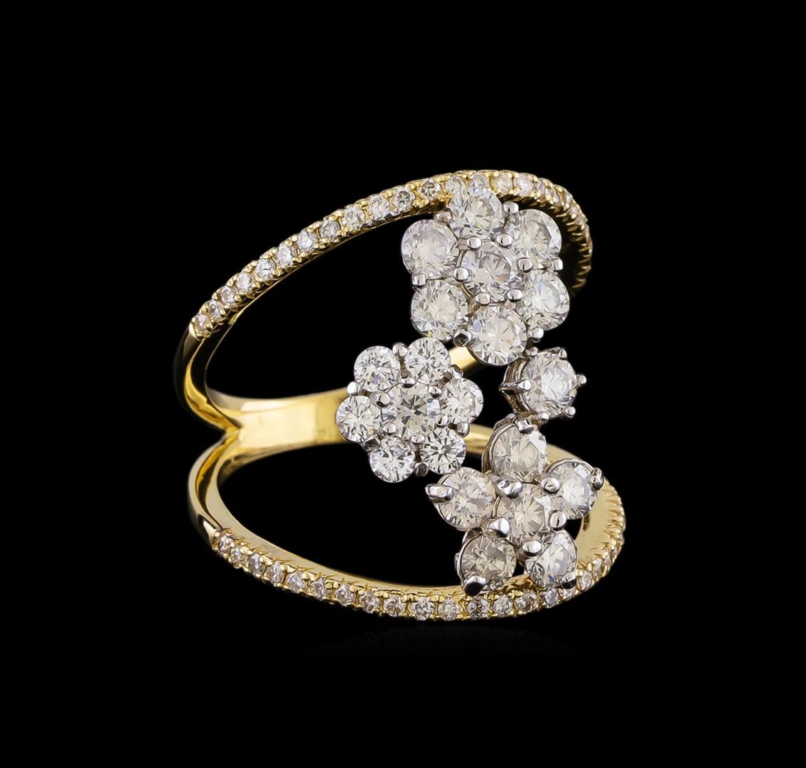 One electronically tested 14KT white and yellow gold lady's combination cast & assembled fashion freeform floral ring with a bright polish finish. The featured lady's has a shank measuring 2.62 millimeters in width. Identified with markings of "K14". Condition is new, good workmanship. Containing: Nine prong set round brilliant cut diamonds, measuring 3.00 - 2.95 x 1.86mm (depth est.) approximate total weight of 9 Stones = 0.95ct. Graded in the setting. Clarity: VS-2 to SI-1. Color: H - I. Cut Very Good Six prong set round brilliant cut diamonds, measuring 2.90 - 2.80 x 1.76mm (depth est.) approximate total weight of 6 Stones = 0.54ct. Graded in the setting. Clarity: VS-2 to SI-1. Color: H - I. Cut Very Good Six round brilliant cut diamonds, measuring 2.30 - 2.20 x 1.38mm (depth est.) approximate total weight of 6 Stones = 0.25ct. Graded in the setting. Clarity: VS-2 to SI-2. Color: G - Good Fifty-Four prong set round brilliant cut diamonds, measuring 1.30 - 1.20 x 0.76mm (depth est.) approximate total weight of 54 Stones = 0.38ct. Graded in the setting. Clarity: SI-1 to I-1. Color: H - I. Cut Good. Total Weight of Diamonds 2.12ct. Total Weight of Freeform Floral Ring 5.40gm. GAS Appraised.