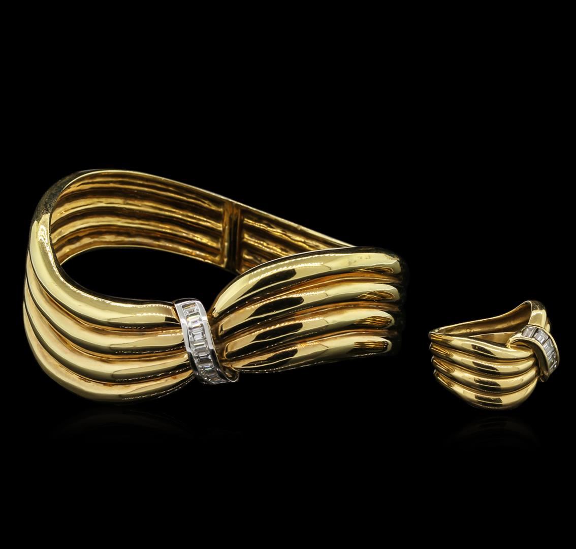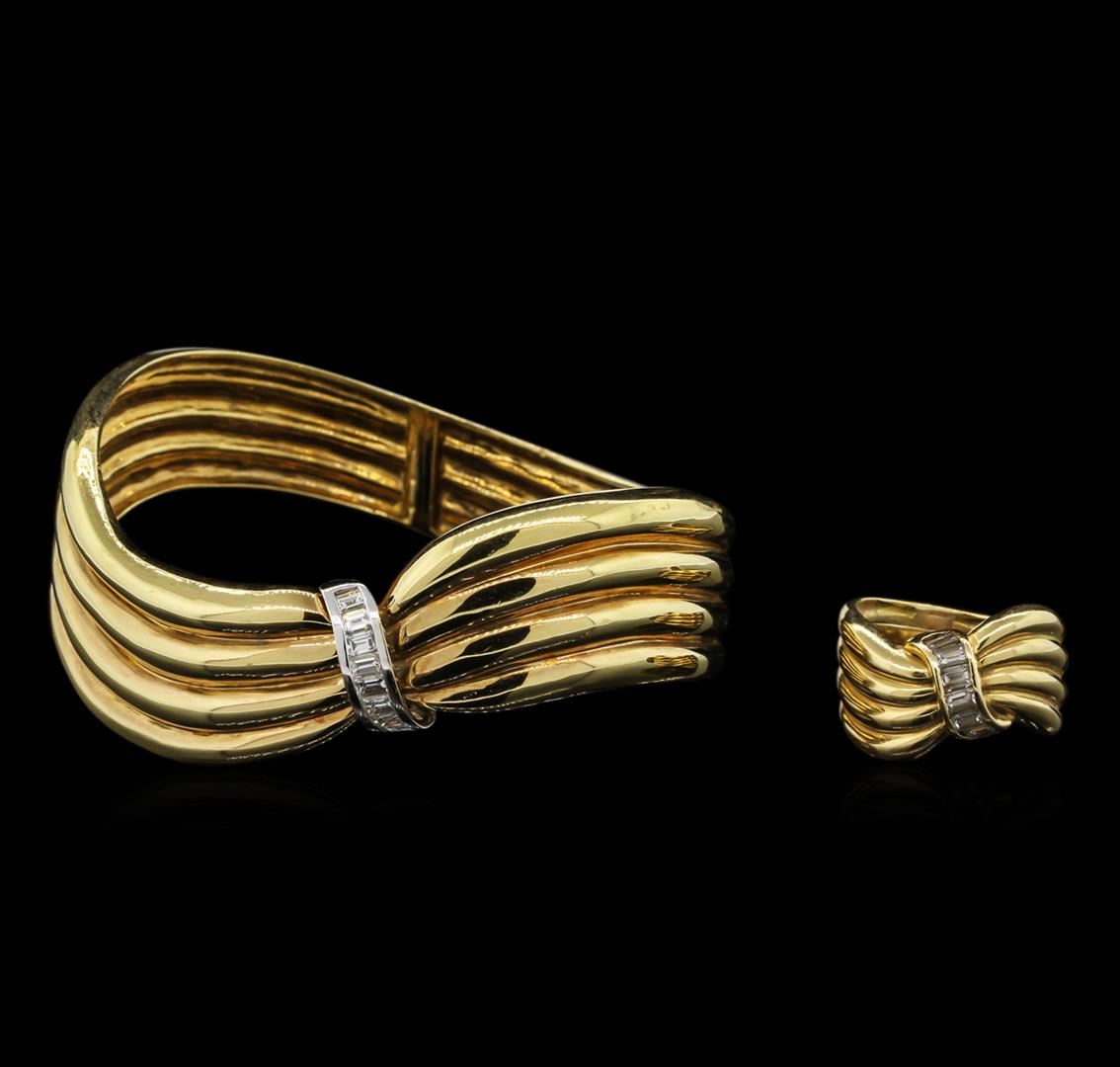 One electronically tested 18KT yellow gold ladies cast & assembled diamond suite. Condition is good. The suite contains a bangle bracelet and a ring. The seven and one-half wearable length bangle bracelet features a ribbed gold ribbon with a diagonally place diamond ribbon accent supported by a hinged shoulder, terminating in a hidden box clasp. The suite is completed by a matching diamond ring with a grooved eight and one-half millimeter wide band. Bright polish finish with rhodium accents. Trademark is alder. Identified with markings of "18K 750". Containing: Fourteen channel set baguette cut diamonds, measuring from 3.20 x 2.40 x 1.80mm (depth est.) to 3.50 x 2.60 x 1.95mm (depth est.) approximate total weight of 14 Stones = 2.12ct. Graded in the setting. Clarity: VS-1 to VS-2. Color: G - H. Total Weight of Diamonds: 2.12ct. Total Weight of Suite: 58.75 gm. AIG Appraised at $13,735.00.