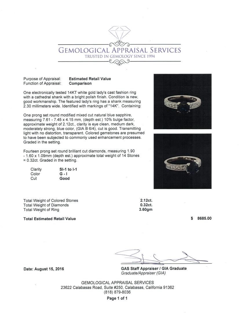 One electronically tested 14KT white gold lady's cast fashion ring with a cathedral shank with a bright polish finish. The featured lady's ring has a shank measuring 2.30 millimeters wide. Identified with markings of '14K'. Condition is new, good workmanship. Containing: One prong set round modified mixed cut natural blue sapphire, measuring 7.61 - 7.45 x 4.15 mm, (depth est.) 10%. bulge factor, approximate weight of 2.12ct., clarity is eye clean, medium dark, moderately strong, blue color, (GIA B 6/4), cut is good. Transmitting light with no distortion, transparent. Colored gemstones are presumed to have been subjected to commonly used enhancement processes. Graded in the setting. Fourteen prong set round brilliant cut diamonds, measuring 1.90 - 1.60 x 1.09mm (depth est.) approximate total weight of 14 Stones = 0.32ct. Graded in the setting. Clarity SI-1 to I-1. Color: G - I Cut Good. Total Weight of Colored Stones 2.12ct.. Total Weight of Diamonds 0.32ct.. Total Weight of Ring 3.60gm. GAS Appraised at $8,685.00.