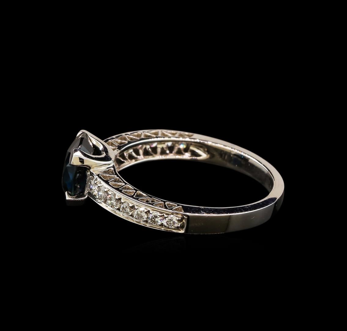 One electronically tested 14KT white gold lady's cast fashion ring with a cathedral shank with a bright polish finish. The featured lady's ring has a shank measuring 2.30 millimeters wide. Identified with markings of '14K'. Condition is new, good workmanship. Containing: One prong set round modified mixed cut natural blue sapphire, measuring 7.61 - 7.45 x 4.15 mm, (depth est.) 10%. bulge factor, approximate weight of 2.12ct., clarity is eye clean, medium dark, moderately strong, blue color, (GIA B 6/4), cut is good. Transmitting light with no distortion, transparent. Colored gemstones are presumed to have been subjected to commonly used enhancement processes. Graded in the setting. Fourteen prong set round brilliant cut diamonds, measuring 1.90 - 1.60 x 1.09mm (depth est.) approximate total weight of 14 Stones = 0.32ct. Graded in the setting. Clarity SI-1 to I-1. Color: G - I Cut Good. Total Weight of Colored Stones 2.12ct.. Total Weight of Diamonds 0.32ct.. Total Weight of Ring 3.60gm. GAS Appraised at $8,685.00.