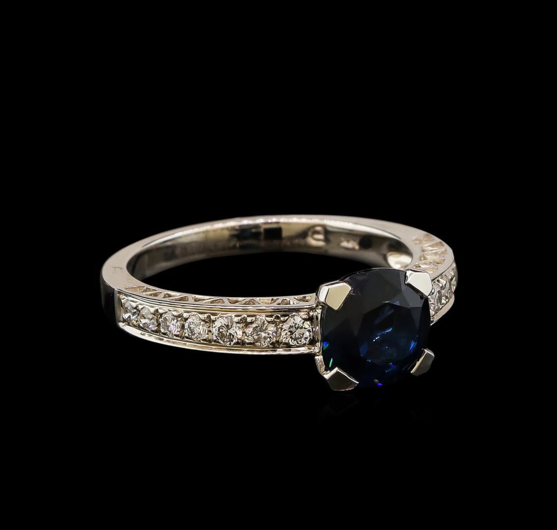 One electronically tested 14KT white gold lady's cast fashion ring with a cathedral shank with a bright polish finish. The featured lady's ring has a shank measuring 2.30 millimeters wide. Identified with markings of '14K'. Condition is new, good workmanship. Containing: One prong set round modified mixed cut natural blue sapphire, measuring 7.61 - 7.45 x 4.15 mm, (depth est.) 10%. bulge factor, approximate weight of 2.12ct., clarity is eye clean, medium dark, moderately strong, blue color, (GIA B 6/4), cut is good. Transmitting light with no distortion, transparent. Colored gemstones are presumed to have been subjected to commonly used enhancement processes. Graded in the setting. Fourteen prong set round brilliant cut diamonds, measuring 1.90 - 1.60 x 1.09mm (depth est.) approximate total weight of 14 Stones = 0.32ct. Graded in the setting. Clarity SI-1 to I-1. Color: G - I Cut Good. Total Weight of Colored Stones 2.12ct.. Total Weight of Diamonds 0.32ct.. Total Weight of Ring 3.60gm. GAS Appraised at $8,685.00.