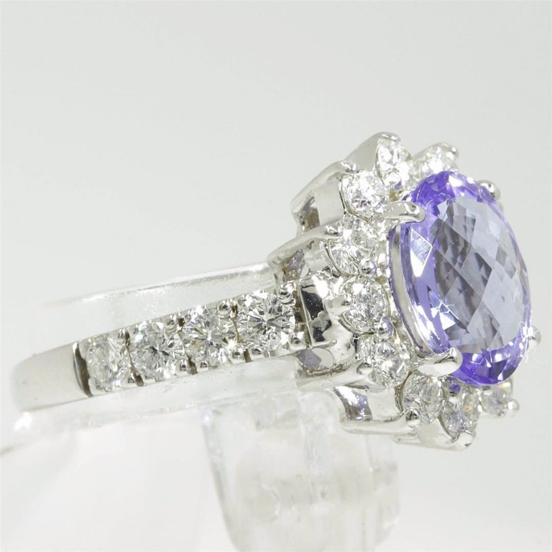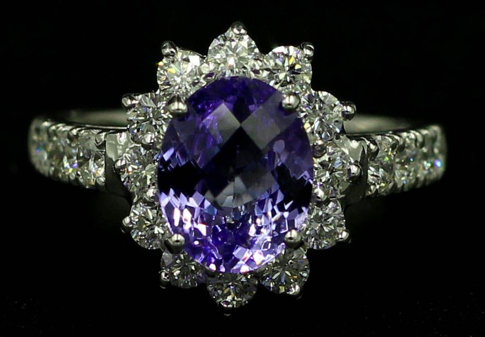 One ring featuring: 14KT white gold weighing 4.16 grams containing one tanzanite weighing 2.12ct and 24 diamonds weighing 1.14ctw. The tanzanite is oval shape with fine clarity and medium blue color with very good cut. The diamonds are round brilliant cut