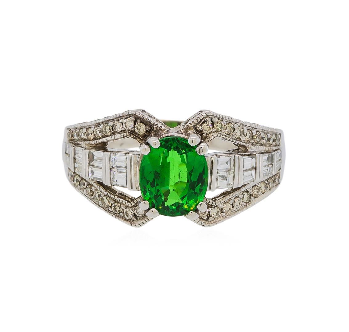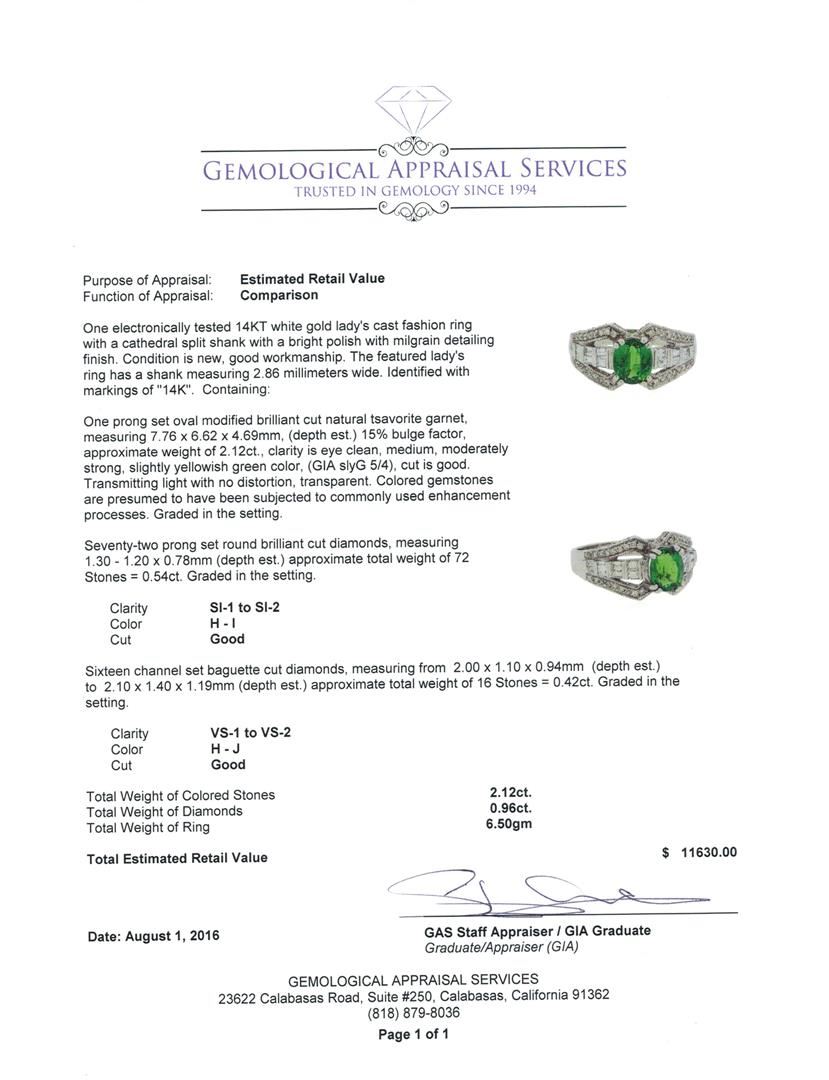 One electronically tested 14KT white gold lady's cast fashion ring with a cathedral split shank with a bright polish with milgrain detailing finish. The featured lady's ring has a shank measuring 2.86 millimeters wide. Identified with markings of '14K'. Condition is new, good workmanship. Containing: One prong set oval modified brilliant cut natural tsavorite garnet, measuring 7.76 x 6.62 x 4.69mm, (depth est.) 15%. bulge factor, approximate weight of 2.12ct., clarity is eye clean, medium, moderately strong, slightly yellowish green color, (GIA slyG 5/4), cut is good. Transmitting light with no distortion, transparent. Colored gemstones are presumed to have been subjected to commonly used enhancement processes. Graded in the setting. Seventy-Two prong set round brilliant cut diamonds, measuring 1.30 - 1.20 x 0.78mm (depth est.) approximate total weight of 72 Stones = 0.54ct. Graded in the setting. Clarity SI-1 to SI-2. Color: H - I Cut Good Sixteen channel set baguette cut diamonds, measuring from 2.00 x 1.10 x 0.94mm (depth est.) to 2.10 x 1.40 x 1.19mm (depth est.) approximate total weight of 16 Stones = 0.42ct. Graded in the setting. Clarity VS-1 to VS-2. Color: H - J Cut Good. Total Weight of Colored Stones 2.12ct.. Total Weight of Diamonds 0.96ct.. Total Weight of Ring 6.50gm. GAS Appraised at $11,630.00.