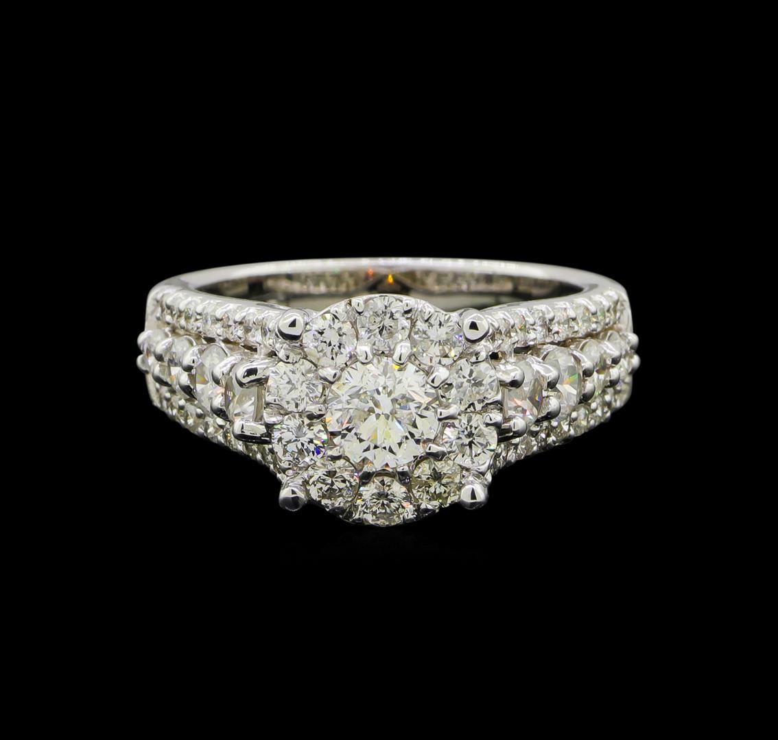 One electronically tested 14KT white gold lady's cast wedding ring with a basket halo with a bright polish finish. The featured lady's ring has a shank measuring 3.84 millimeters wide. Identified with markings of '585'. Condition is new, good workmanship. Containing: One prong set round brilliant cut diamond, measuring 5.15 - 5.11 x 3.08mm (depth est.) approximate weight of 0.50ct. Graded in the setting. Clarity SI-1. Color: H Cut Very Good Four prong set round brilliant cut diamonds, measuring 3.20 - 3.05 x 1.94mm (depth est.) approximate total weight of 4 Stones = 0.46ct. Graded in the setting. Clarity VS-2 to SI-1. Color: I - J Cut Good Four prong set round brilliant cut diamonds, measuring 2.70 - 2.40 x 1.58mm (depth est.) approximate total weight of 4 Stones = 0.28ct. Graded in the setting. Clarity SI-1 to SI-2. Color: G - I Cut Good Ten prong set round brilliant cut diamonds, measuring 2.40 - 2.30 x 1.46mm (depth est.) approximate total weight of 10 Stones = 0.49ct. Graded in the setting. Clarity SI-1 to SI-2. Color: H - I Cut Good Thirty-Two prong set round brilliant cut diamonds, measuring 1.50 - 1.45 x 0.92mm (depth est.) approximate total weight of 32 Stones = 0.40ct. Graded in the setting. Clarity SI-1 to SI-2. Color: H - I Cut Good. Total Weight of Diamonds 2.13ct.. Total Weight of Ring 6.60gm. GAS Appraised at $8,755.00.