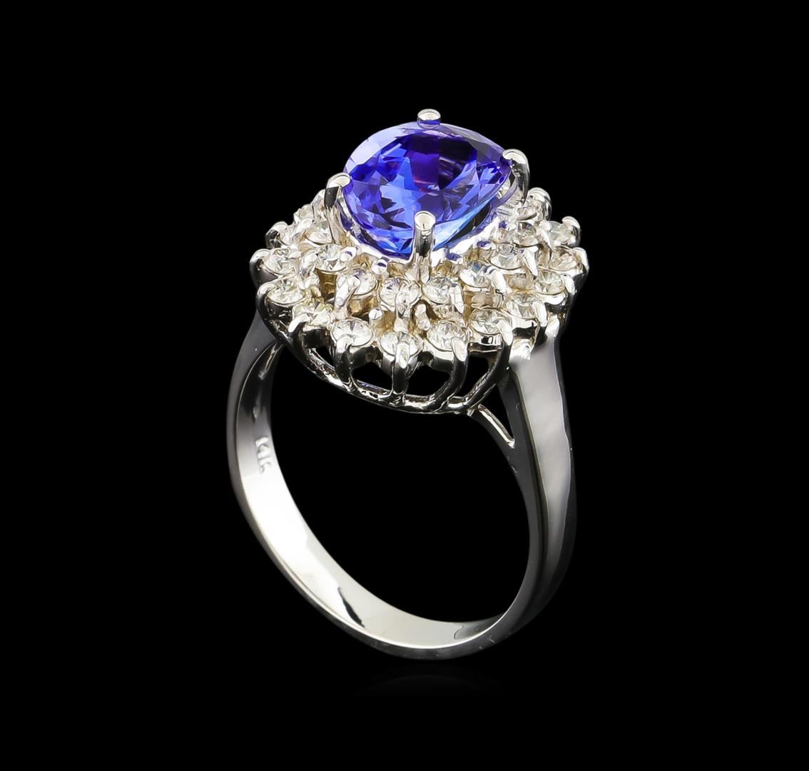 One electronically tested 14KT white gold lady's cast fashion ring with a double basket halo with a bright polish finish. The featured lady's ring has a shank measuring 2.80 millimeters wide. Identified with markings of "14K". Condition is new, good workmanship. Containing: One prong set oval modified brilliant cut natural tanzanite, measuring 9.27 x 6.93 x 4.80mm, approximate weight of 2.13ct., clarity is eye clean, type I, medium dark, very slightly grayish, violetish blue color, (GIA vB 6/3), cut is good. Transmitting light with no distortion, transparent. Colored gemstones are presumed to have been subjected to commonly used enhancement processes. Graded in the setting. Thirty-Two prong set round brilliant cut diamonds, measuring 1.90 - 1.80 x 1.13mm (depth est.) approximate total weight of 32 Stones = 0.75ct. Graded in the setting. Clarity: VS-2 to SI-2. Color: G - I. Cut Good. Total Weight of Colored Stones 2.13ct. Total Weight of Diamonds 0.75ct. Total Weight of Ring 5.60gm. GAS Appraised at $5,830.00.
