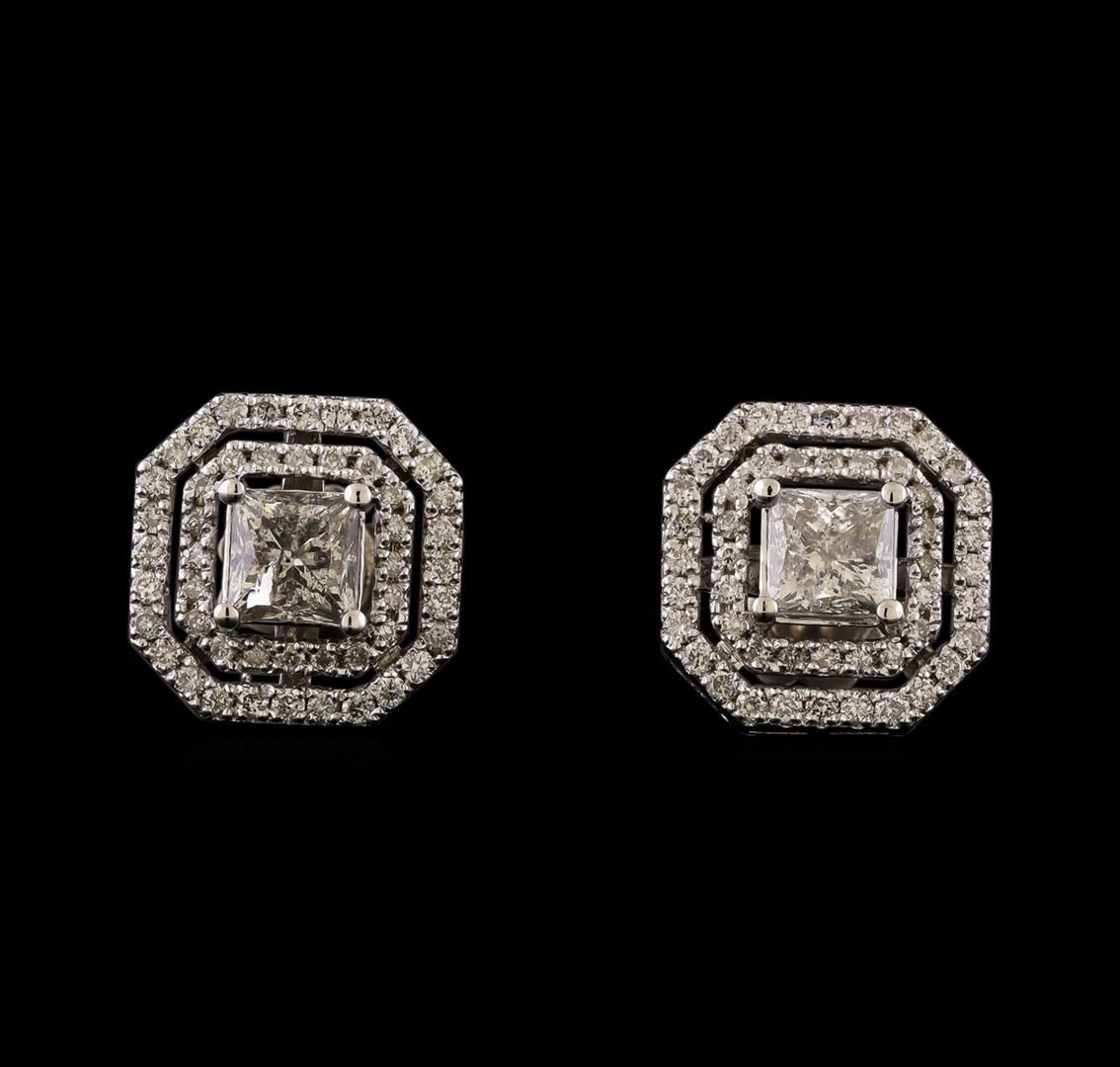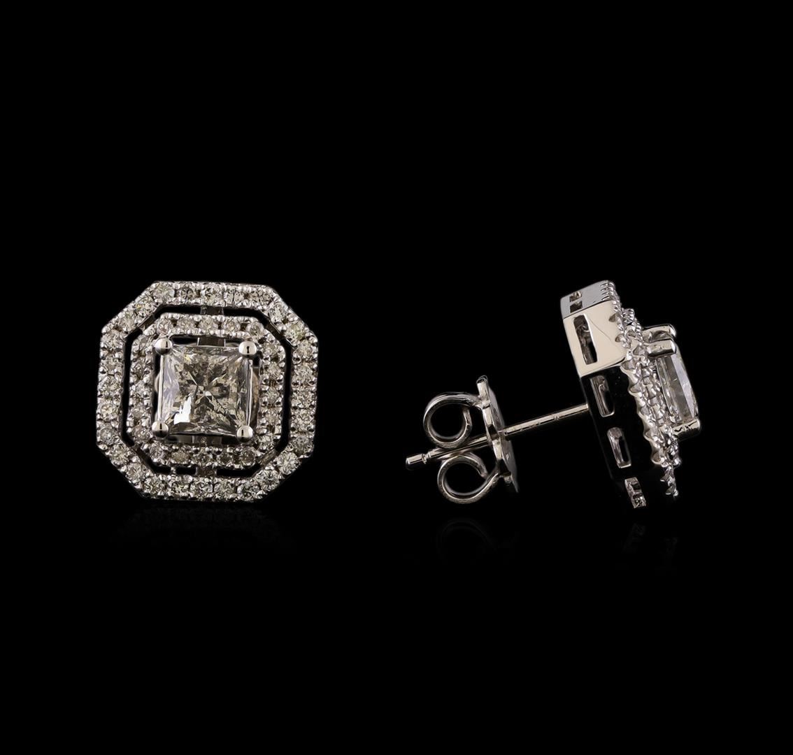 One pair electronically tested 14KT white gold lady's cast stud earrings with friction posts with a double halo with a bright polish finish. Identified with markings of '585'. Condition is new, good workmanship. Containing: Two prong set princess cut diamonds, measuring 4.76 x 4.55 x 3.70mm (depth est.) , 10.00.%. GTCF approximate total weight of 2 Stones = 1.48ct. Graded in the setting. Clarity I-1. Color: G - H Cut Very Good Fifty-Six prong set round brilliant cut diamonds, measuring 1.30 - 1.25 x 0.79mm (depth est.) approximate total weight of 56 Stones = 0.46ct. Graded in the setting. Clarity SI-1 to SI-2. Color: G - H Cut Good Forty prong set round brilliant cut diamonds, measuring 1.10 - 1.05 x 0.67mm (depth est.) approximate total weight of 40 Stones = 0.20ct. Graded in the setting. Clarity SI-1 to SI-2. Color: G - H Cut Good. Total Weight of Diamonds 2.14ct.. Total Weight of Earrings 5.00gm. GAS Appraised at $12,210.00.