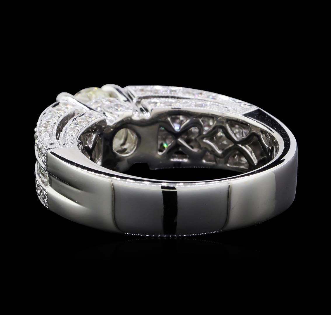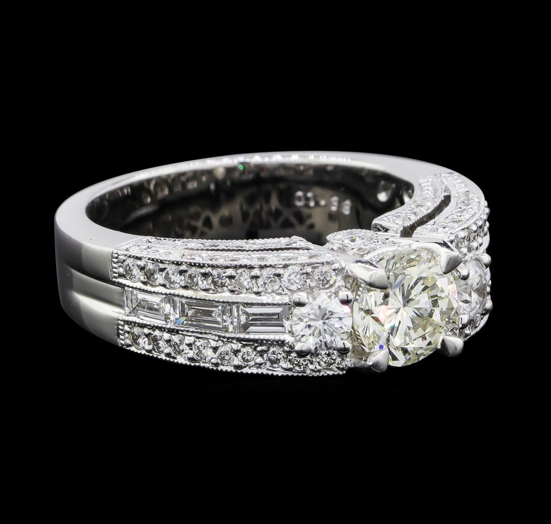 One electronically tested 18KT white gold lady's cast wedding ring with a split cathedral shank with a bright polish with milgrain detailing finish. The featured lady's ring has a shank measuring 4.83 millimeters wide. Identified with markings of 'K18'. Condition is new, good workmanship. Containing: One prong set round brilliant cut diamond, measuring 6.13 - 6.11 x 3.98mm (depth est.) , 5.00.%. GTCF approximate weight of 1.00ct. Graded in the setting. Clarity VS-2. Color: J Cut Good Two prong set round brilliant cut diamonds, measuring 3.10 - 3.05 x 1.91mm (depth est.) approximate total weight of 2 Stones = 0.22ct. Graded in the setting. Clarity SI-1 to SI-2. Color: G - H Cut Good Two bezel set round brilliant cut diamonds, measuring 1.90 - 1.85 x 1.17mm (depth est.) approximate total weight of 2 Stones = 0.05ct. Graded in the setting. Clarity SI-1 to SI-2. Color: G - H Cut Good Six channel set baguette cut diamonds, measuring from 3.40 x 1.50 x 1.28mm (depth est.) to 3.60 x 1.60 x 1.36mm (depth est.) approximate total weight of 6 Stones = 0.40ct. Graded in the setting. Clarity VS-1 to VS-2. Color: G - H Cut Very Good Seventy-Six prong set round brilliant cut diamonds, measuring 1.30 - 1.05 x 0.73mm (depth est.) approximate total weight of 76 Stones = 0.47ct. Graded in the setting. Clarity VS-2 to SI-1. Color: G - H Cut Good. Total Weight of Diamonds 2.14ct.. Total Weight of Ring 10.00gm. GAS Appraised at $15,670.00.