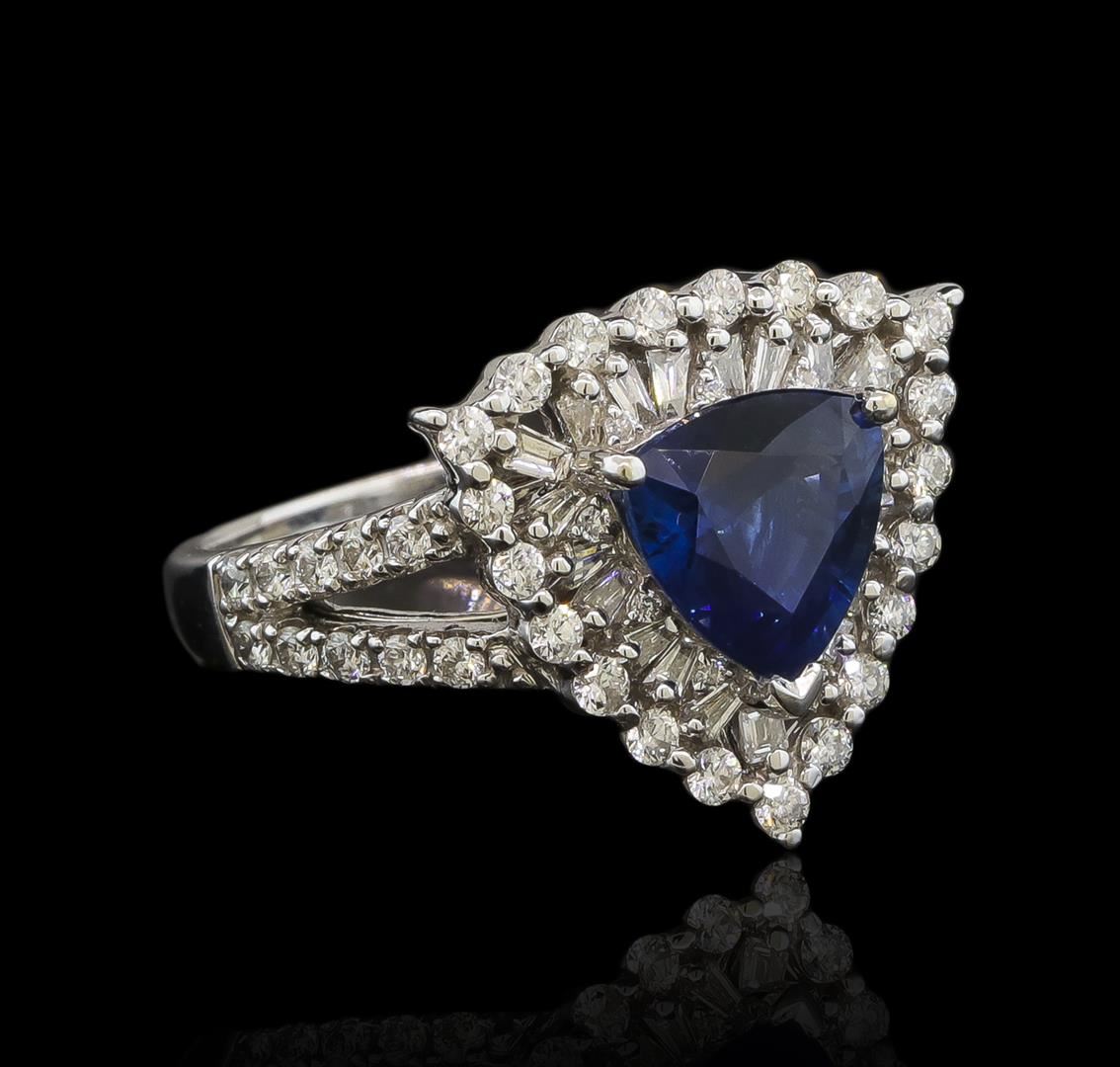 One electronically tested 14KT white gold lady's cast fashion ring with a split shank basket halo with a bright polish finish. The featured lady's ring has a shank measuring 2.44 millimeters wide. Identified with markings of '14K'. Condition is new, good workmanship. Containing: One prong set triangle modified brilliant cut natural blue sapphire, measuring 8.20 x 8.30 x 4.33mm, (depth est.) approximate weight of 2.14ct., clarity is eye clean, medium, very slightly grayish, blue color, (GIA B 5/3), cut is good. Transmitting light with no distortion, transparent. Colored gemstones are presumed to have been subjected to commonly used enhancement processes. Graded in the setting. Twenty-One prong set baguette cut (tapered) diamonds, measuring from 1.85 x 1.10 x 0.94mm (depth est.) to 1.90 x 1.70 x 1.45mm (depth est.) approximate total weight of 21 Stones = 0.65ct. Graded in the setting. Clarity VS-2 to SI-1. Color: H - I Cut Very Good Forty-One prong set round brilliant cut diamonds, measuring 1.70 - 1.50 x 0.99mm (depth est.) approximate total weight of 41 Stones = 0.63ct. Graded in the setting. Clarity SI-1 to SI-2. Color: H - I Cut Good Nine prong set round brilliant cut diamonds, measuring 1.00 - 0.90 x 0.59mm (depth est.) approximate total weight of 9 Stones = 0.03ct. Graded in the setting. Clarity VS-2 to SI-2. Color: G - H Cut Good. Total Weight of Colored Stones 2.14ct.. Total Weight of Diamonds 1.31ct.. Total Weight of Ring 5.60gm. GAS Appraised at $10,445.00.