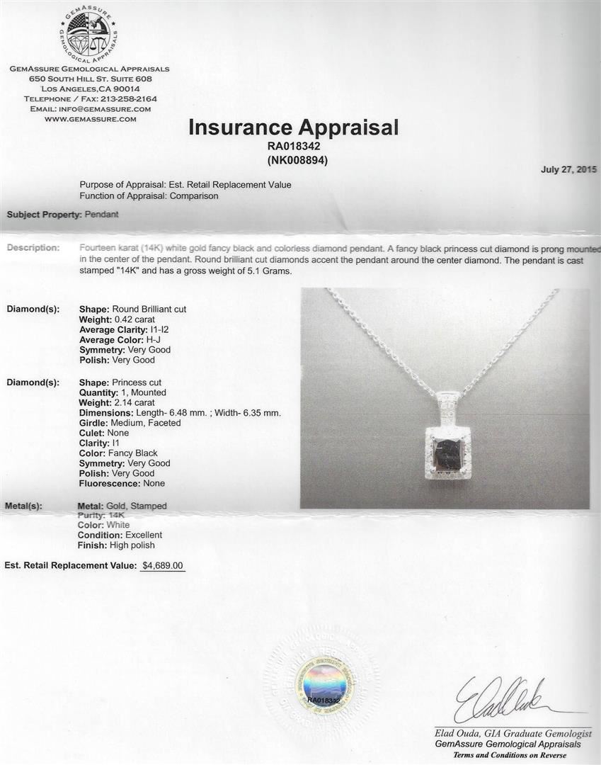 Fourteen karat (14K) white gold fancy black and colorless stud diamond pendant. A fancy black princess cut diamond is prong mounted in the center of the pendant. Round brilliant cut diamonds accent the pendant around the center diamond. The pendant is cast stamped "14K" and have a gross weight of 5.1 Grams. Diamond(s): Shape: Round Brilliant cut. Weight: 0.42 carat. Average Clarity: I1-I2. Average Color: H-J. Symmetry: Very Good. Polish: Very Good. Diamond(s): Shape: Princess cut. Quantity: 1, Mounted. Weight: 2.14 carat. Dimensions: Max. Diameter- 6.48 mm. ; Min. Diameter- 6.35 mm. Girdle: Medium, Faceted. Culet: None. Clarity: I1. Color: Fancy Black. Symmetry: Very Good. Polish: Very Good. Fluorescence: None. Metal(s): Metal: Gold, Stamped. Purity: 14K. Color: White. Condition: Excellent. Finish: High polish. GGA Appraised at $4,689.00.