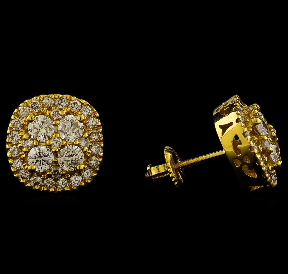 One pair electronically tested 14KT yellow gold cast & assembled diamond earrings with screw backs. Each earring features an organized diamond cluster set within a diamond bezel and supported by a lattice under gallery. Bright polish finish. Identified with markings of "14K". Condition is new, good workmanship. Containing: Eight prong set round brilliant cut diamonds, measuring 3.50 - 3.40 x 2.07mm (depth est.) approximate total weight of 8 Stones = 1.25ct. Graded in the setting. Clarity: SI-2 to I-1. Color: F - G Fifty prong set round brilliant cut diamonds, measuring 1.70 - 1.60 x 0.99mm (depth est.) approximate total weight of 50 Stones = 0.90ct. Graded in the setting. Clarity: SI-1 to SI-2. Color: F - H. Total Weight of Diamonds 2.15ct. Total Weight of Earrings 5.54gm. AIG Appraised at $8,405.00.