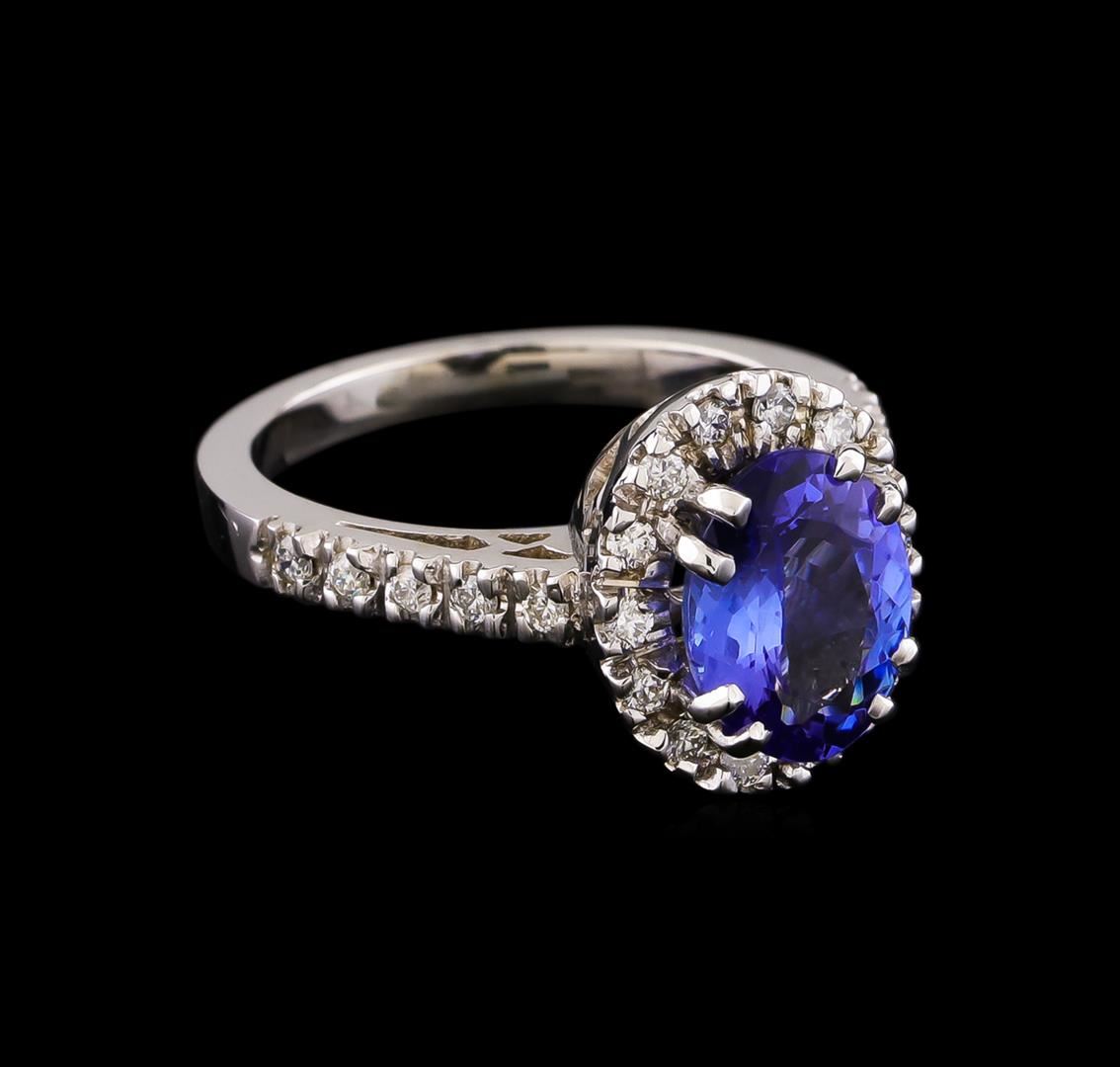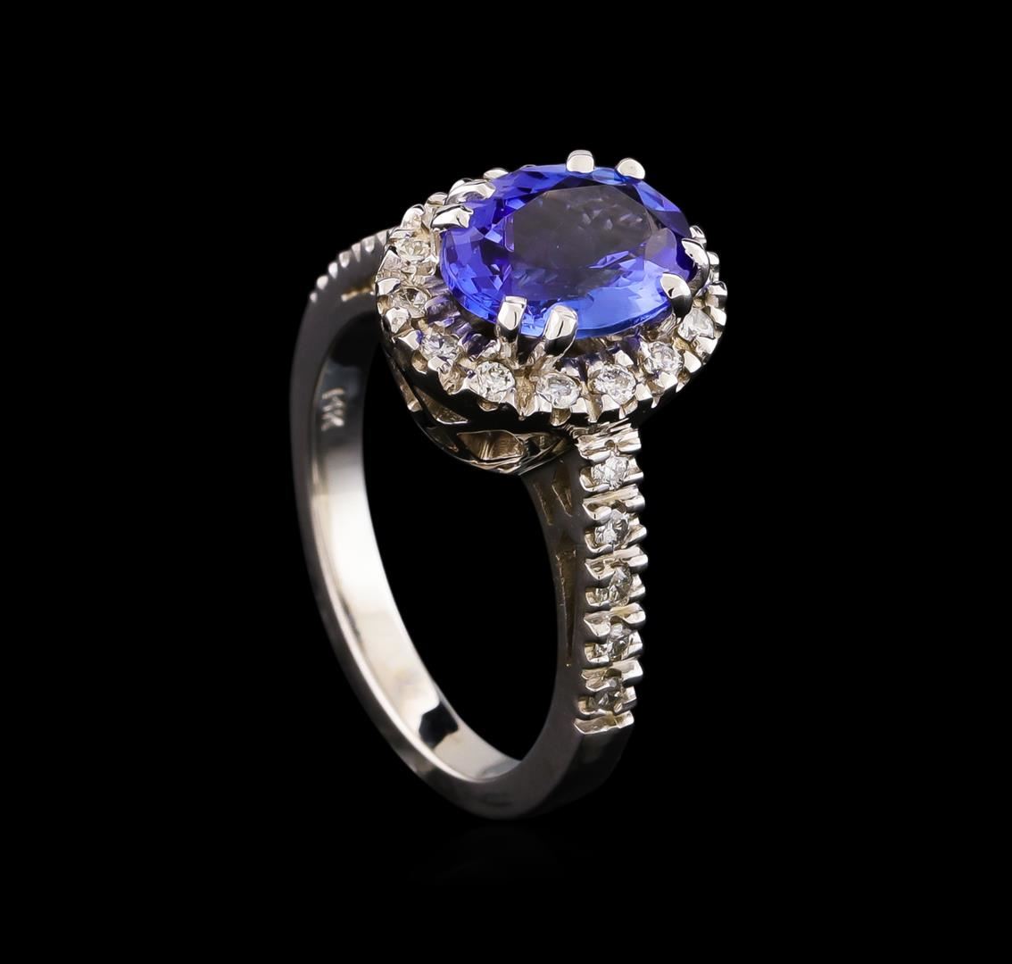One electronically tested 14KT white gold lady's cast fashion ring with a cathedral halo with a bright polish finish. The featured lady's ring has a shank measuring 2.25 millimeters wide. Identified with markings of "14K". Condition is new, good workmanship. Containing: One prong set oval modified brilliant cut natural tanzanite, measuring 9.57 x 7.40 x 4.28mm, approximate weight of 2.15ct., clarity is eye clean, medium, very slightly grayish, bluish violet color, (GIA bV 5/3), cut is good. Transmitting light with no distortion, transparent. Colored gemstones are presumed to have been subjected to commonly used enhancement processes. Graded in the setting. Twenty-Four prong set round brilliant cut diamonds, measuring 1.60 - 1.50 x 0.96mm (depth est.) approximate total weight of 24 Stones = 0.35ct. Graded in the setting. Clarity: VS-2 to SI-2. Color: H - I. Cut Good. Total Weight of Colored Stones 2.15ct. Total Weight of Diamonds 0.35ct. Total Weight of Ring 5.80gm. GAS Appraised at $4,530.00.