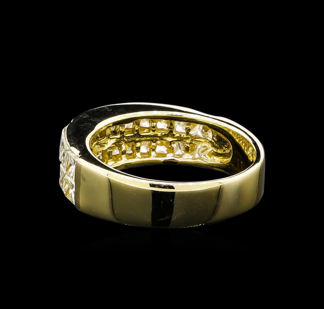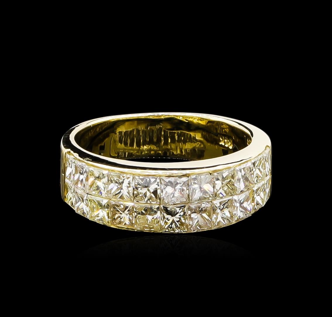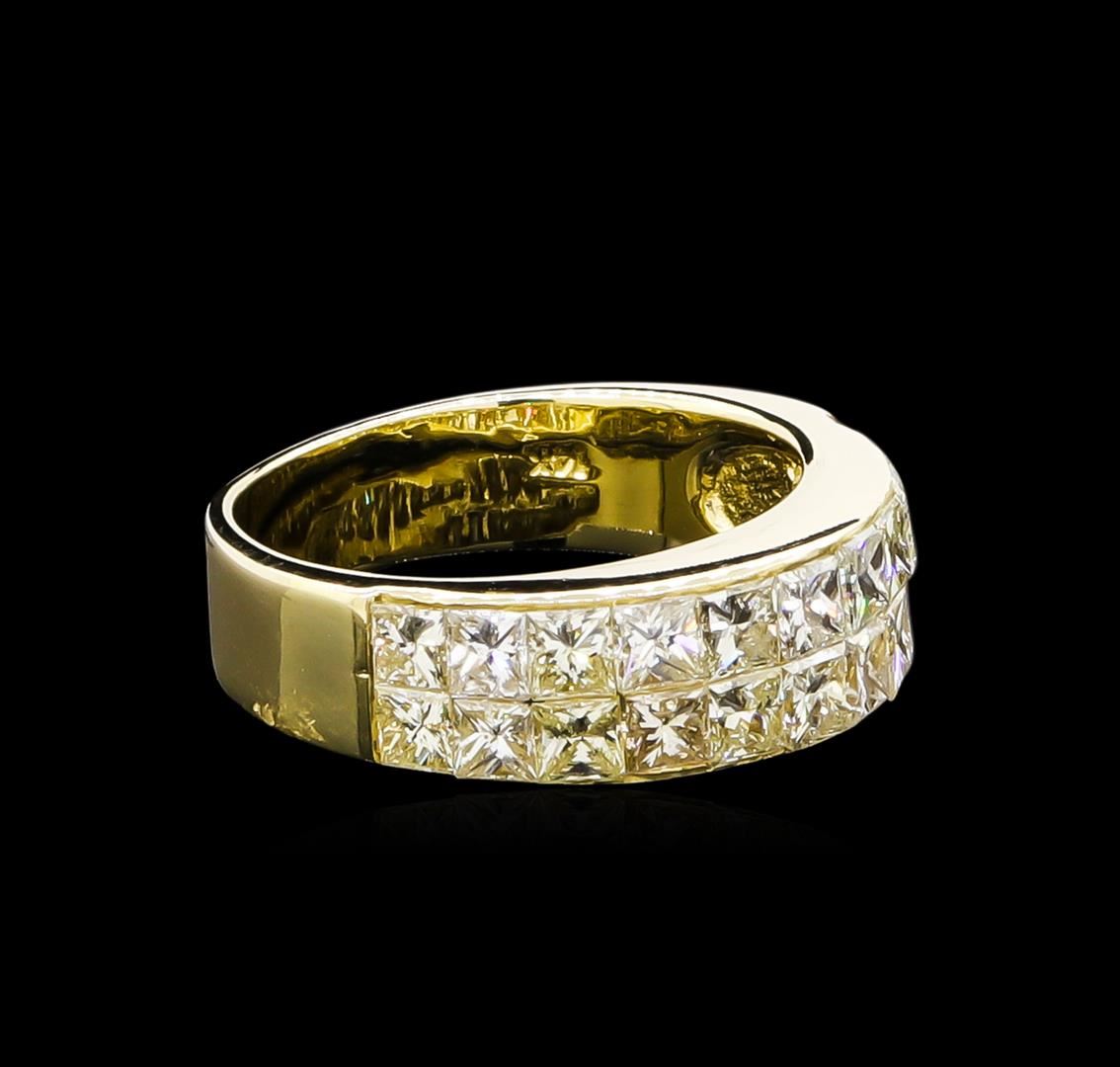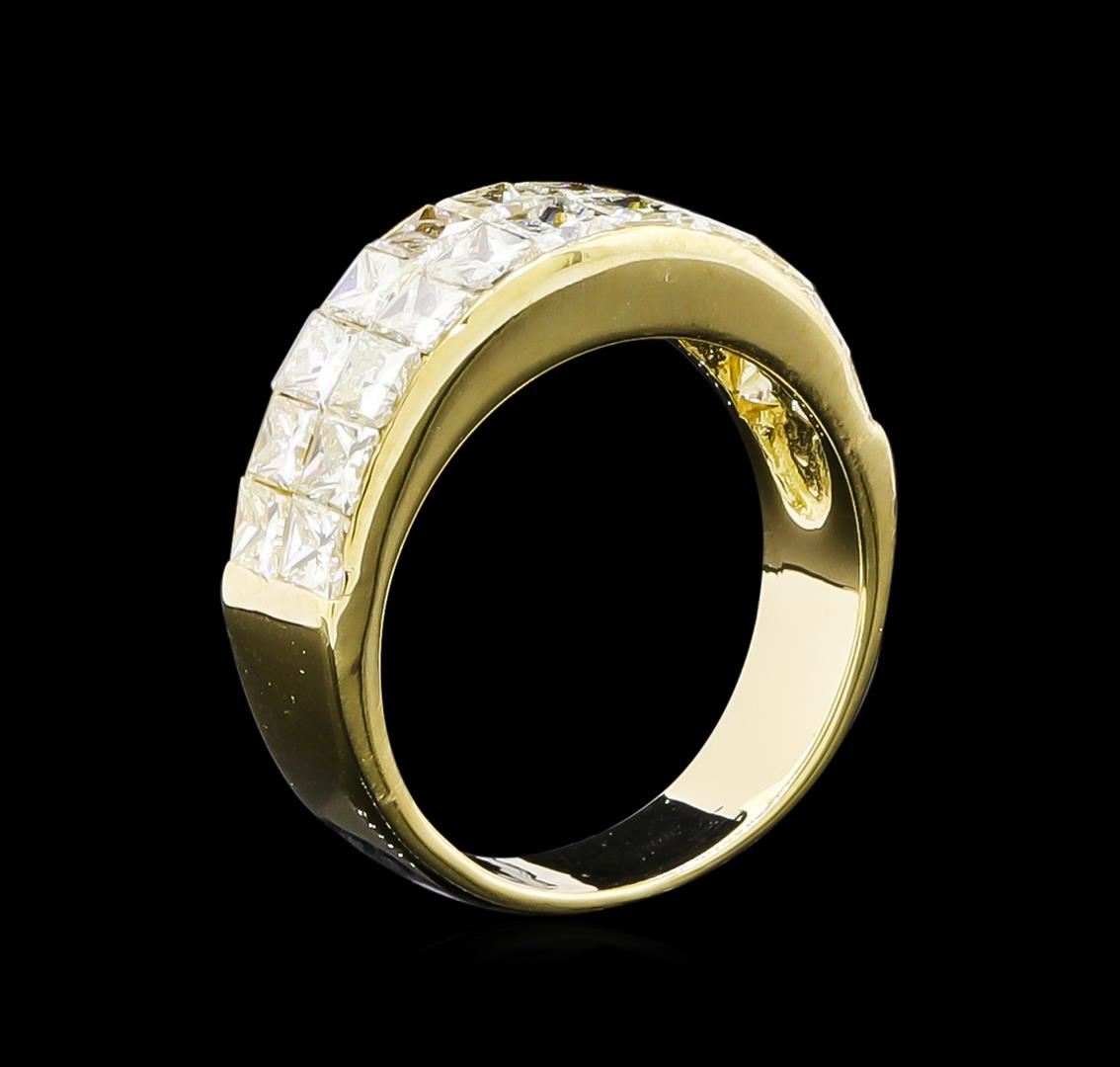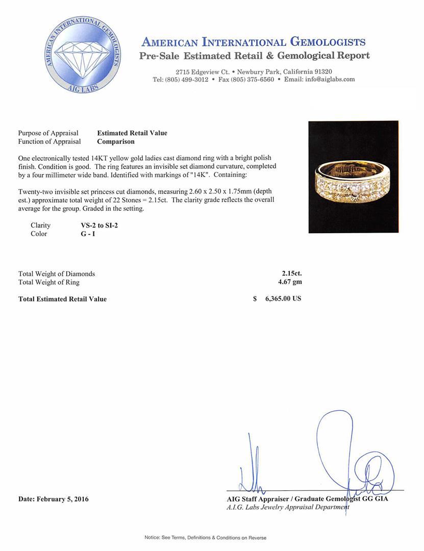 One electronically tested 14KT yellow gold ladies cast diamond ring with a bright polish finish. The ring features an invisible set diamond curvature, completed by a four millimeter wide band. Identified with markings of "14K". Condition is good. Containing: Twenty-Two invisible set princess cut diamonds, measuring 2.60 x 2.50 x 1.75mm (depth est.) approximate total weight of 22 Stones = 2.15ct. The clarity grade reflects the overall average for the group. Graded in the setting. Clarity: VS-2 to SI-2. Color: G - I. Total Weight of Diamonds 2.15ct. Total Weight of Ring 4.67gm. AIG Appraised at $6,365.00.