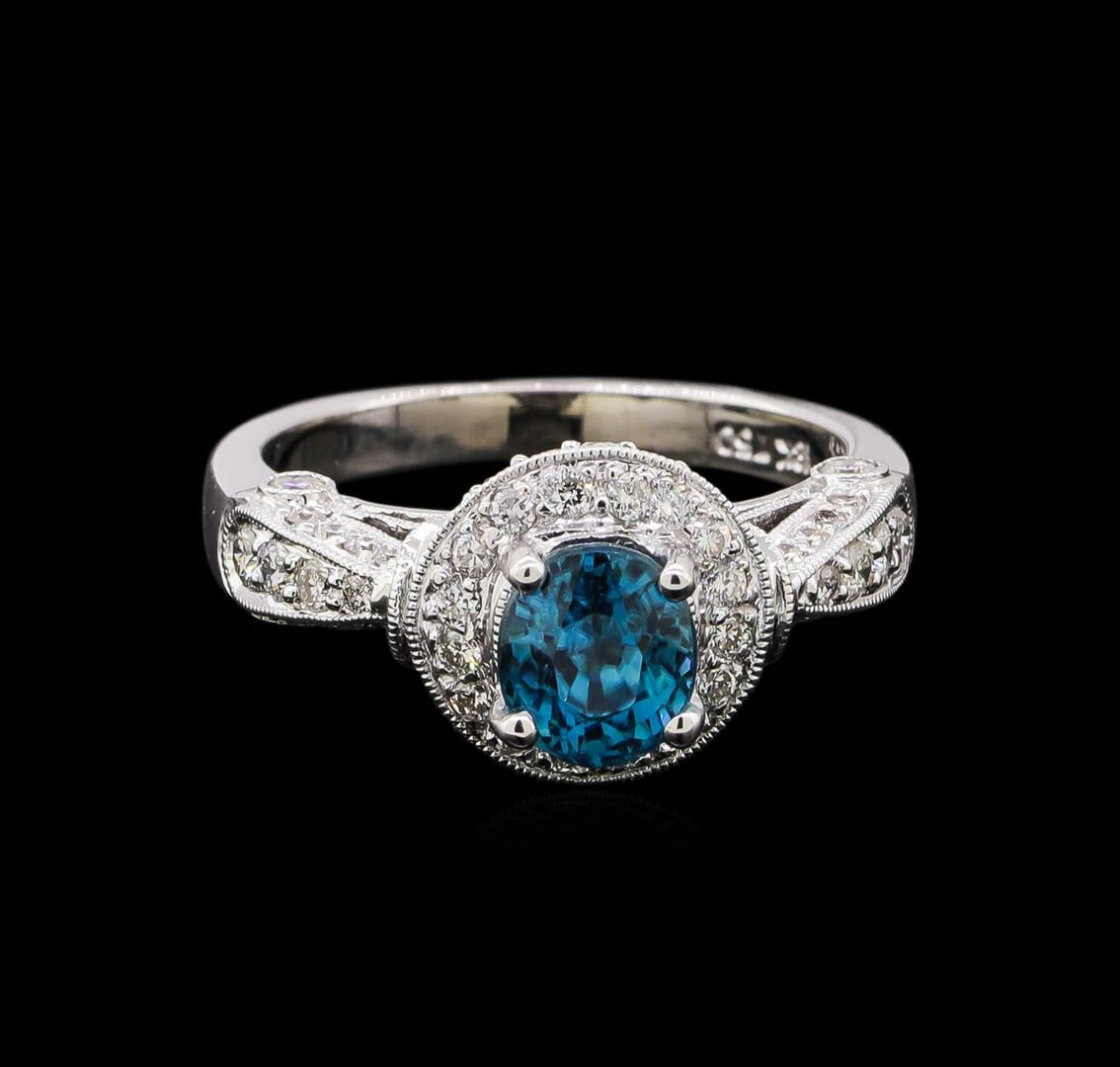 One electronically tested 18KT white gold ladies cast blue zircon and diamond ring. The featured blue zircon is set within a diamond bezel supported by a diamond accented under gallery and stylized diamond set shoulders, completed by a two millimeter wide band. Bright polish finish with milgrain detailing. Identified with markings of '18K 750'. Condition is new, good workmanship. Containing: One prong set oval mixed cut natural blue zircon, measuring 6.90 x 5.90 x 4.70mm, 10%. bulge factor, approximate weight of 2.16ct., clarity is eye clean, type I, medium, moderately strong, very strongly greenish blue color, (GIA vstgB 5/4), cut is good. Transmitting light with no distortion, transparent. Graded in the setting. Sixty prong set round brilliant cut diamonds, measuring 1.60 - 1.30 x 0.87mm (depth est.) approximate total weight of 60 Stones = 0.73ct. The clarity grade reflects the entire range of clarity for this group. Graded in the setting. Clarity SI-1 to I-2. Color: F - H. Total Weight of Colored Stones 2.16ct.. Total Weight of Diamonds 0.73ct.. Total Weight of Ring 6.75gm. AIG Appraised at $4,545.00.