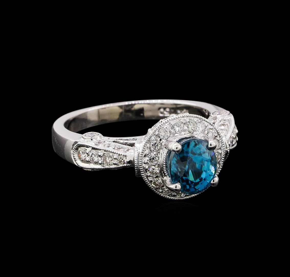 One electronically tested 18KT white gold ladies cast blue zircon and diamond ring. The featured blue zircon is set within a diamond bezel supported by a diamond accented under gallery and stylized diamond set shoulders, completed by a two millimeter wide band. Bright polish finish with milgrain detailing. Identified with markings of '18K 750'. Condition is new, good workmanship. Containing: One prong set oval mixed cut natural blue zircon, measuring 6.90 x 5.90 x 4.70mm, 10%. bulge factor, approximate weight of 2.16ct., clarity is eye clean, type I, medium, moderately strong, very strongly greenish blue color, (GIA vstgB 5/4), cut is good. Transmitting light with no distortion, transparent. Graded in the setting. Sixty prong set round brilliant cut diamonds, measuring 1.60 - 1.30 x 0.87mm (depth est.) approximate total weight of 60 Stones = 0.73ct. The clarity grade reflects the entire range of clarity for this group. Graded in the setting. Clarity SI-1 to I-2. Color: F - H. Total Weight of Colored Stones 2.16ct.. Total Weight of Diamonds 0.73ct.. Total Weight of Ring 6.75gm. AIG Appraised at $4,545.00.