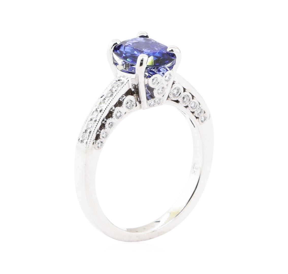 One electronically tested 18KT white gold lady's cast vintage style fashion ring with a straight line cathedral shank with a bright polish with milgrain detailing finish. The featured lady's ring has a shank measuring 2.30 millimeters wide. Identified wit