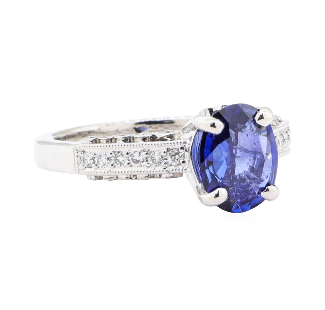 One electronically tested 18KT white gold lady's cast vintage style fashion ring with a straight line cathedral shank with a bright polish with milgrain detailing finish. The featured lady's ring has a shank measuring 2.30 millimeters wide. Identified wit
