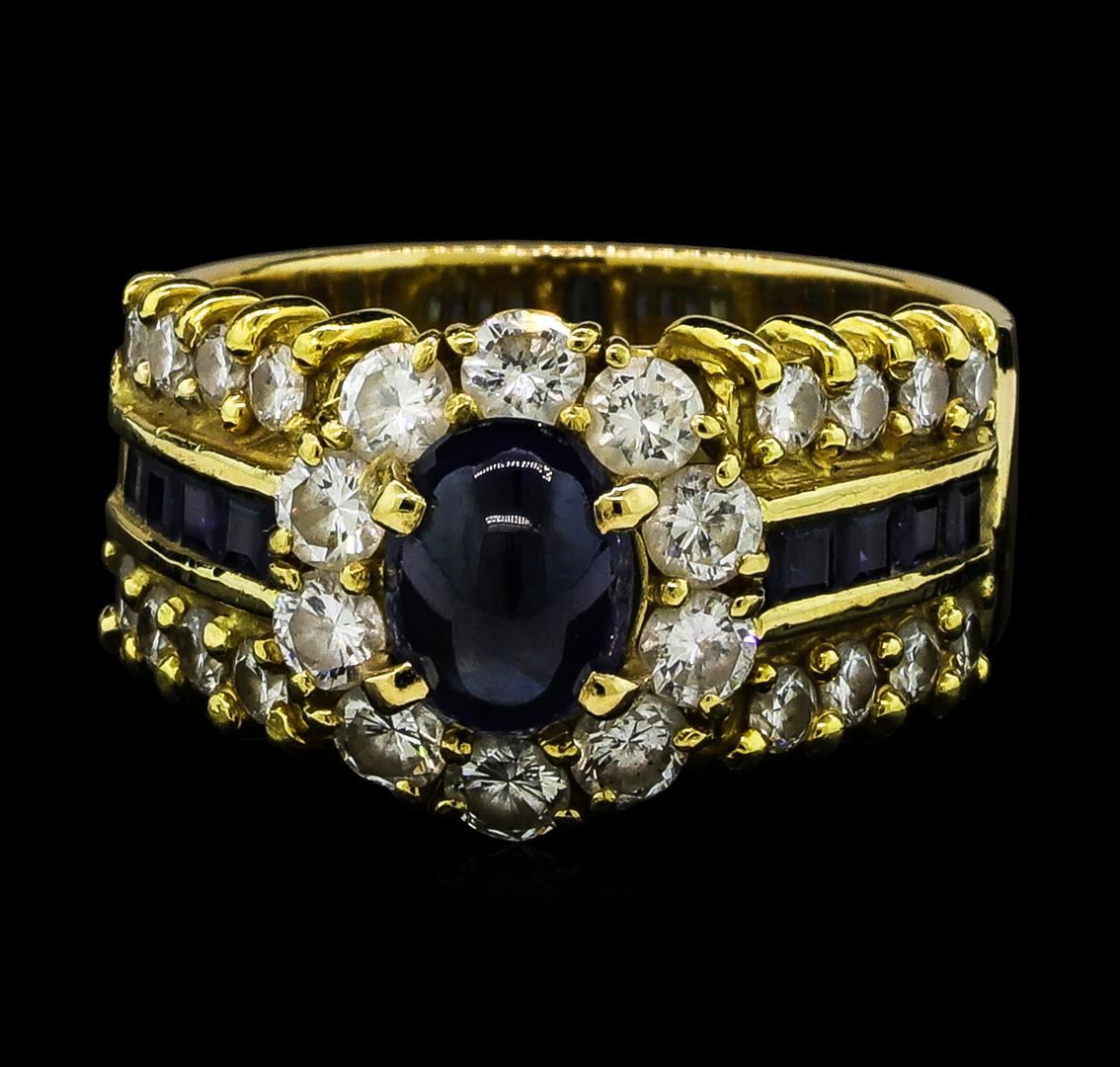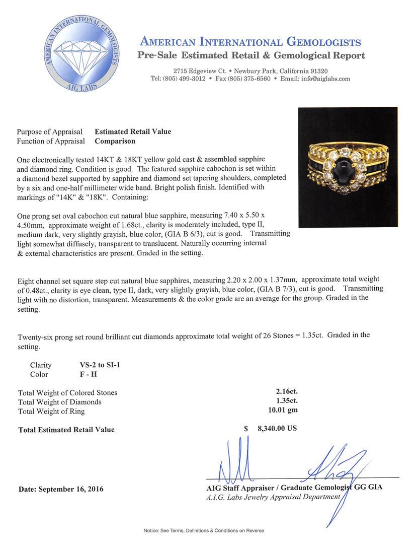 One electronically tested 14KT & 18KT yellow gold cast & assembled sapphire and diamond ring. The featured sapphire cabochon is set within a diamond bezel supported by sapphire and diamond set tapering shoulders, completed by a six and one-half millimeter wide band. Bright polish finish. Identified with markings of '14K' & '18K'. Condition is good. Containing: One prong set oval cabochon cut natural blue sapphire, measuring 7.40 x 5.50 x 4.50mm, approximate weight of 1.68ct., clarity is moderately included, type II, medium dark, very slightly grayish, blue color, (GIA B 6/3), cut is good. Transmitting light somewhat diffusely, transparent to translucent. Naturally occurring internal & external characteristics are present. Graded in the setting. Eight channel set square step cut natural blue sapphires, measuring 2.20 x 2.00 x 1.37mm, approximate total weight of 0.48ct., clarity is eye clean, type II, dark, very slightly grayish, blue color, (GIA B 7/3), cut is good. Transmitting light with no distortion, transparent. Measurements & the color grade are an average for the group. Graded in the setting. Twenty-Six prong set round brilliant cut diamonds approximate total weight of 26 Stones = 1.35ct. Graded in the setting. Clarity VS-2 to SI-1. Color: F - H. Total Weight of Colored Stones 2.16ct.. Total Weight of Diamonds 1.35ct.. Total Weight of Ring 10.01gm. AIG Appraised at $8,340.00.