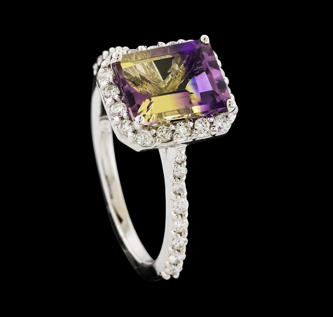 One Ametrine and Diamond Ring featuring: 14KT White Gold with a total weight of 3.82 grams, One Ametrine stone with a total weight of 2.17ct, and 34 Diamonds with a total weight of 0.44ctw.