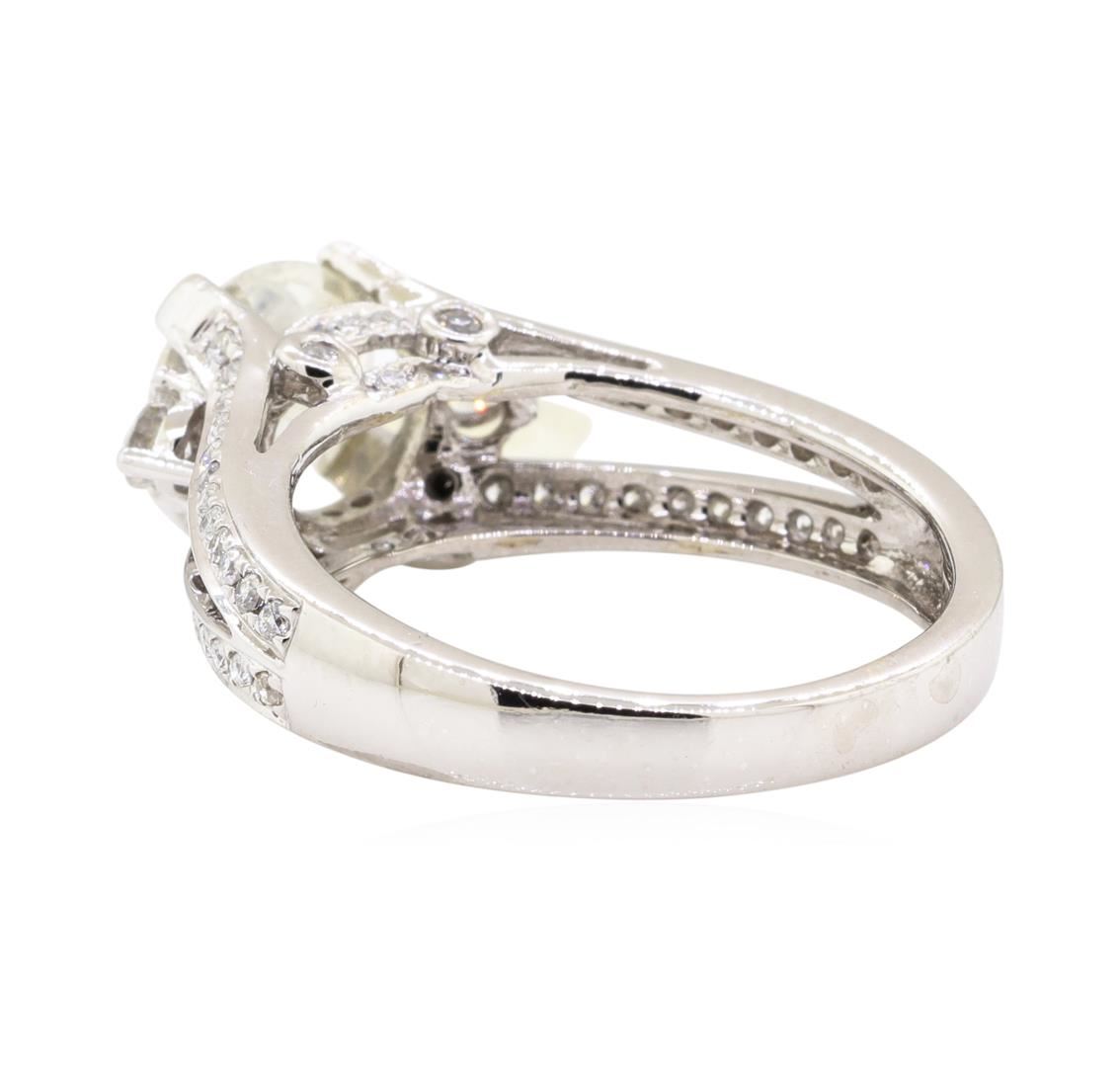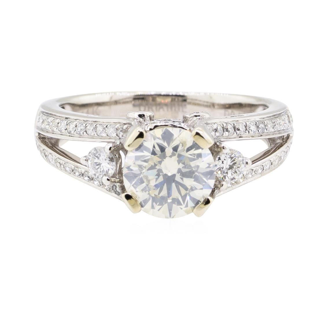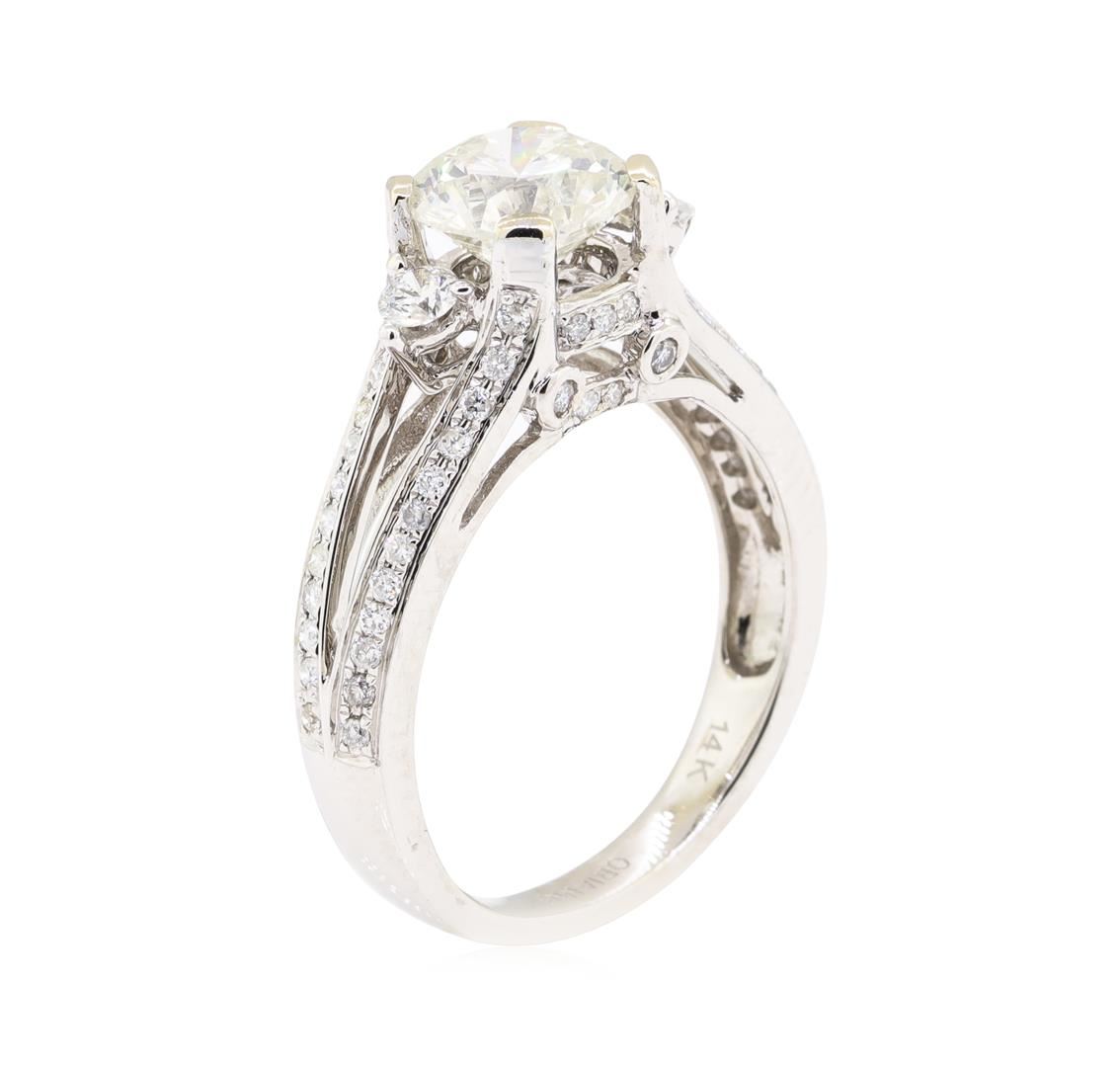 One electronically tested 14KT white gold ladies cast diamond unity ring with a bright polish finish. Condition is new, good workmanship. The featured diamond is supported by diamond set should and completed by a three millimeter wide band. Trademark is Orianne. Identified with markings of "14K". Containing: One prong set round brilliant cut diamond, measuring 7.54 - 7.45 x 4.72mm exact weight of 1.67ct. Graded loose prior to setting in the EGL Laboratory, Report # US904812215D GP. Clarity of SI-3, color of J, 62.9% depth, 59.0% table, 43.5% pavilion depth, and EGL Ideal cut. Forty prong, bead and bezel set round brilliant cut diamonds, measuring 2.80 - 1.00 x 1.14 (depth est.) approximate total weight of 40 Stones = 0.50ct. Graded in the setting. Clarity of I-1 to I-2, color of F-H. Total weight of diamonds is 2.17ctw, total weight of ring is 5.00 grams. AIG appraised at $33,400.00. AIG Appraised.