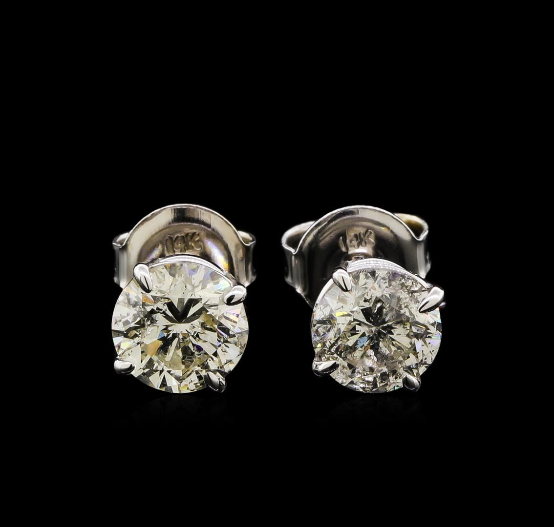One pair electronically tested 14KT white gold cast & assembled diamond solitaire earrings with standard backs. Bright polish finish. Identified with markings of "14K". Condition is new, good workmanship. Containing: One round brilliant cut diamond, measuring 6.29 - 6.28 x 4.00mm (depth est.), 6.00.%. GTCF approximate weight of 1.10ct. Faint brown secondary color throughout. Graded in the setting. Clarity: I-1. Color: K. Depth 63.6%. Table 58.8%. One prong set round brilliant cut diamond, measuring 6.02 - 6.01 x 4.10mm (depth est.), 8.00.%. GTCF approximate weight of 1.07ct. Faint brown secondary color throughout. Graded in the setting. Clarity: I-2. Color: J. Depth 68.1%. Table 58.1%. Total Weight of Diamonds 2.17ct. Total Weight of Earrings 1.31gm. AIG Appraised at $13,850.00.